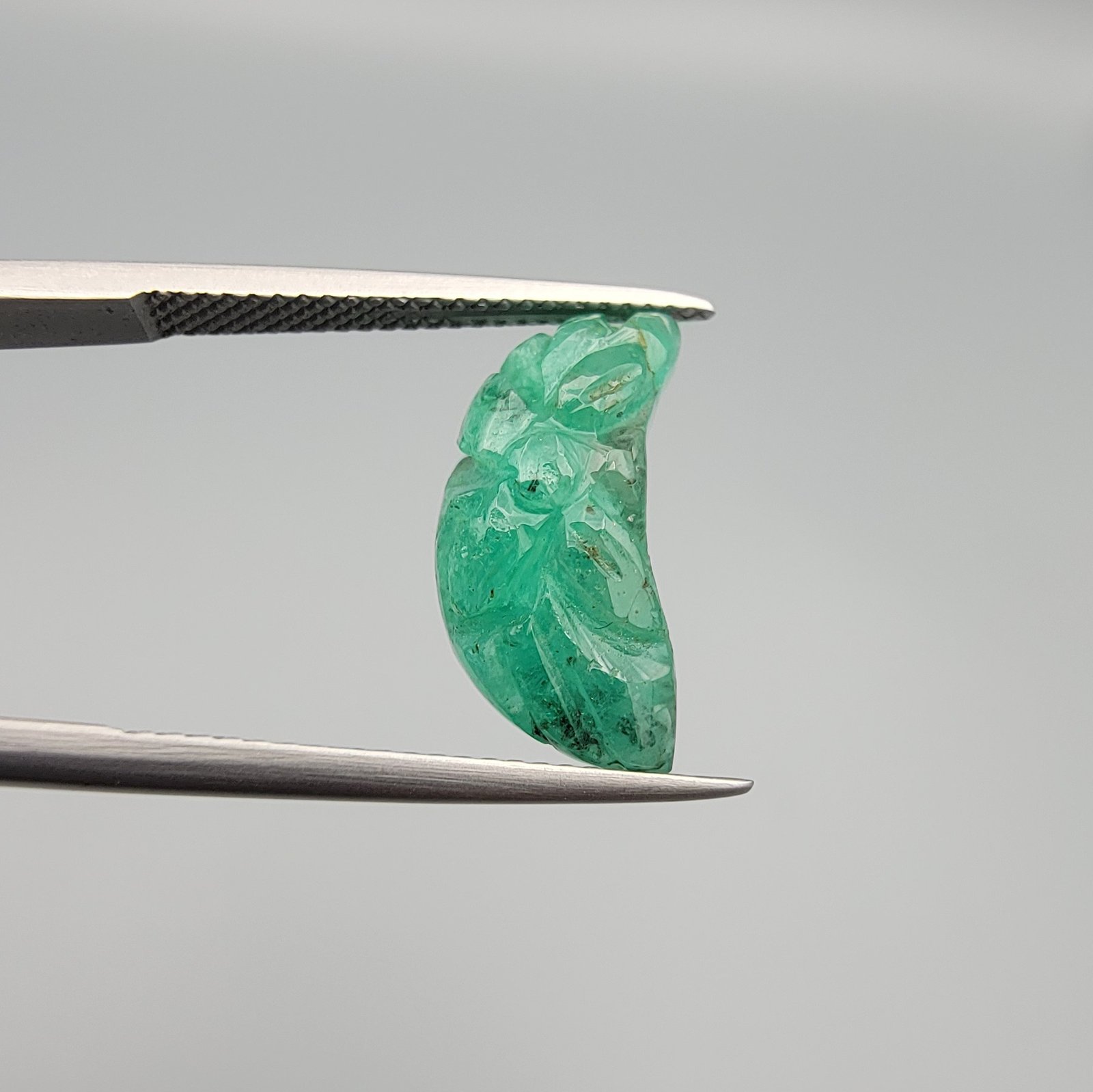 Discover the perfect blend of natural rarity and artisanal mastery with this 6.33-carat hand-carved natural emerald (Panna). Sourced from the prestigious mines of Zambia, known globally for producing emeralds with superior clarity and deep saturation, this stone is a true collector’s piece. The surface is meticulously sculpted with a high-relief floral motif that catches the light from every angle, revealing the stone’s inner brilliance. This untreated, genuine emerald is an exceptional choice for a bespoke luxury pendant or a unique addition to an investment-grade gemstone portfolio.