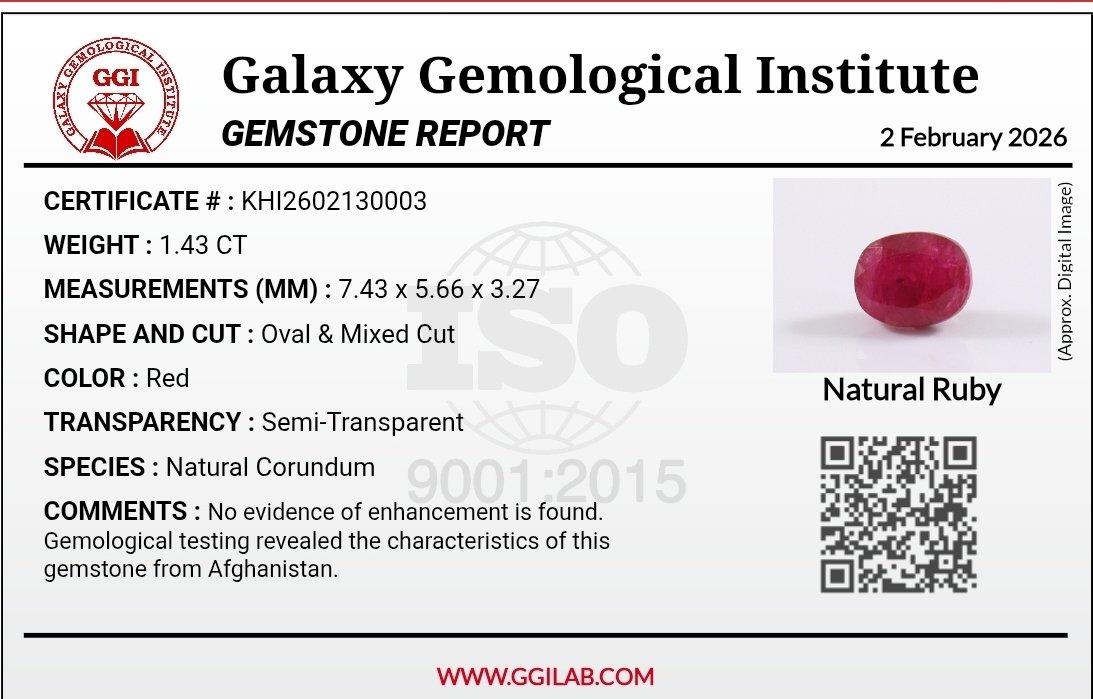 Elevate your collection with this exceptional 1.43-carat natural ruby, ethically sourced from the prestigious mines of Afghanistan. While many rubies on the market undergo thermal enhancement, this specimen has been professionally verified by the Galaxy Gemological Institute (Report #KHI2602130003) to show no evidence of heat treatment. Featuring a classic oval mixed cut, the stone displays a deep, soulful red color and semi-transparent clarity that highlights its natural geological journey. As a member of the natural corundum species, this ruby offers both the durability for a daily luxury ring and the rarity required for a high-value investment.