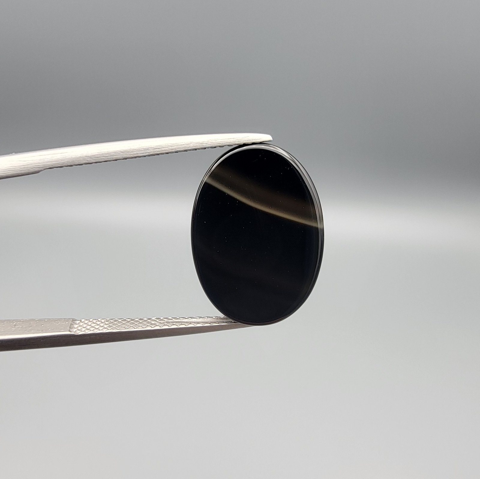 Embrace the timeless tradition of the Sulemani Aqeeq with this 7.49-carat natural black chalcedony agate. Expertly finished into a smooth, high-luster oval cabochon, this specimen displays a rich, midnight-black opacity. Its most defining feature is a clean, horizontal white band crossing the surface, which is a highly sought-after trait in natural banded chalcedony. This stone is a perfect fit for traditional silver signet rings or protective amulets, offering a bold aesthetic that balances ancient spiritual heritage with sophisticated, natural beauty.