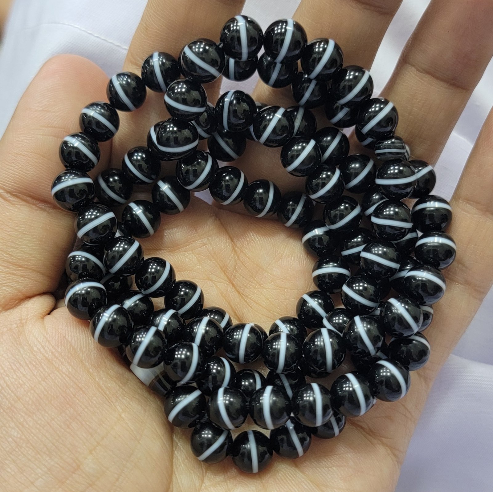 This Natural Black Banded Agate (Sulemani Aqeeq) Tasbeeh is composed of 100 perfectly matched beads, showcasing striking natural white banding against a deep black base. Sourced from Egypt, this tasbeeh is finished with a durable adjustable macrame closure, allowing comfortable use for daily dhikr or collection purposes. The smooth polish, balanced weight, and elegant tassels make it a refined spiritual accessory for those who value authenticity and craftsmanship.