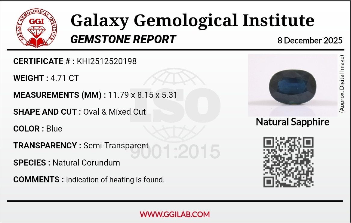 This is a fully certified, natural blue sapphire gemstone, verified by the Galaxy Gemological Institute (GGI Report #: KHI2512520198). Weighing a substantial 4.71 carats and cut into an elegant oval mixed shape (11.79 x 8.15 x 5.31 mm), this natural corundum is semi-transparent with a vibrant blue hue. The certificate notes an indication of heating, a common and accepted practice to enhance color stability. Check the best blue sapphire price in Karachi, Pakistan for this certified piece.