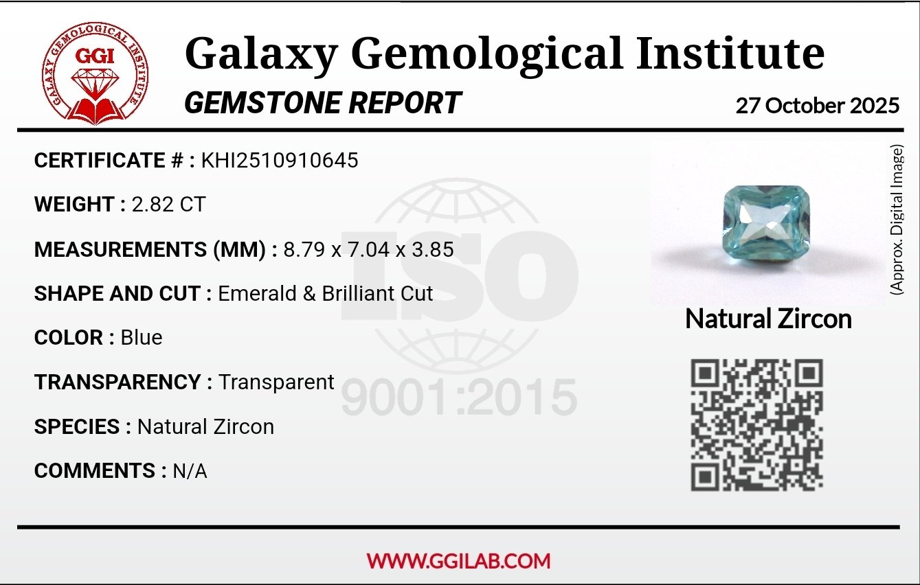 A stunning Natural Blue Zircon weighing 2.82 Carats, masterfully crafted in an Emerald & Brilliant Cut that enhances its sparkling brilliance and transparency. Certified by Galaxy Gemological Institute (GGI Lab), this gemstone radiates a vivid blue hue with exceptional clarity and fire. Perfect for fine jewelry design, gemstone collections, or elegant investment pieces.