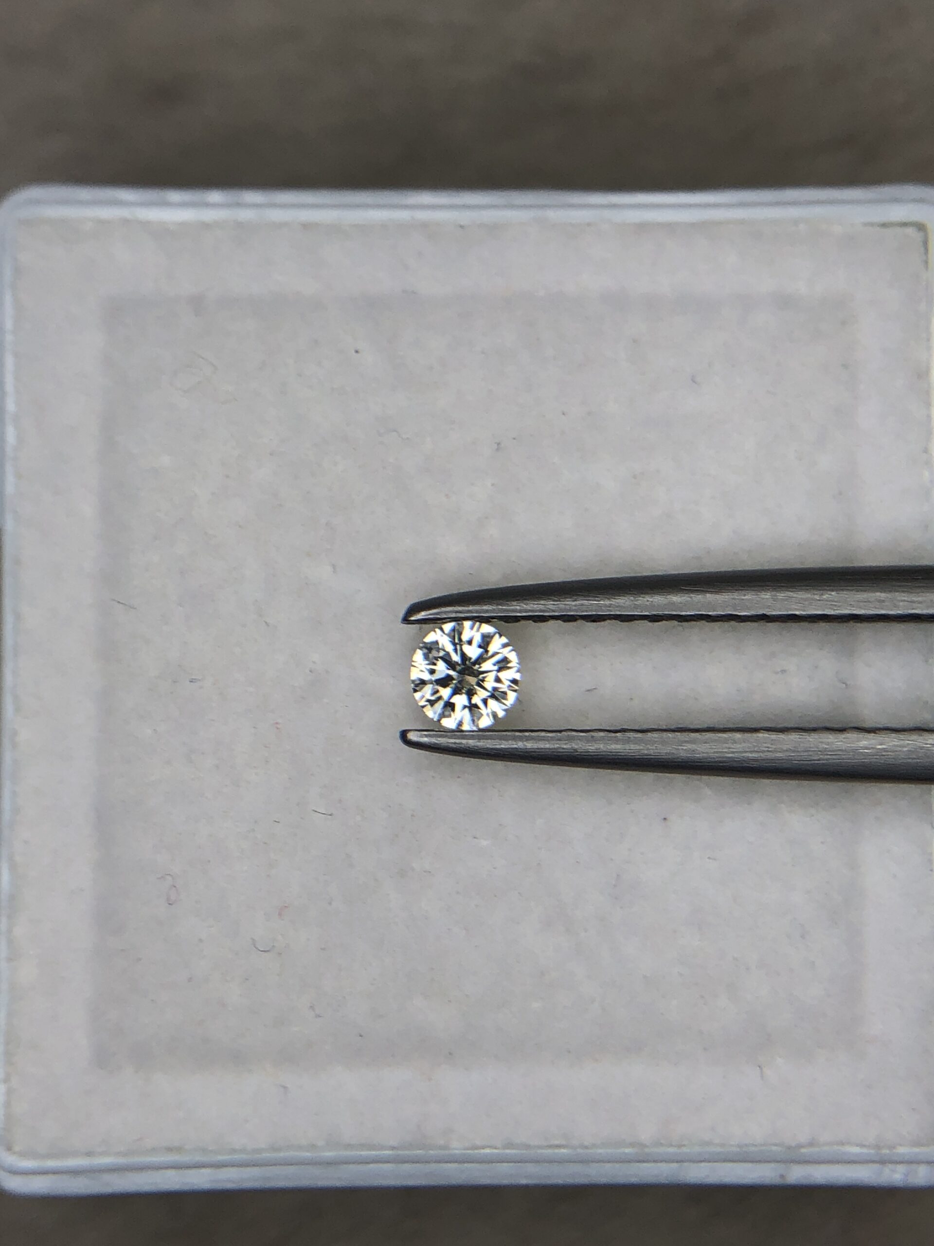 A 0.23-carat natural white diamond (Heera) with a brilliant cushion shape cut, displaying high fire and sparkle under professional lighting, held in jeweler's tweezers.