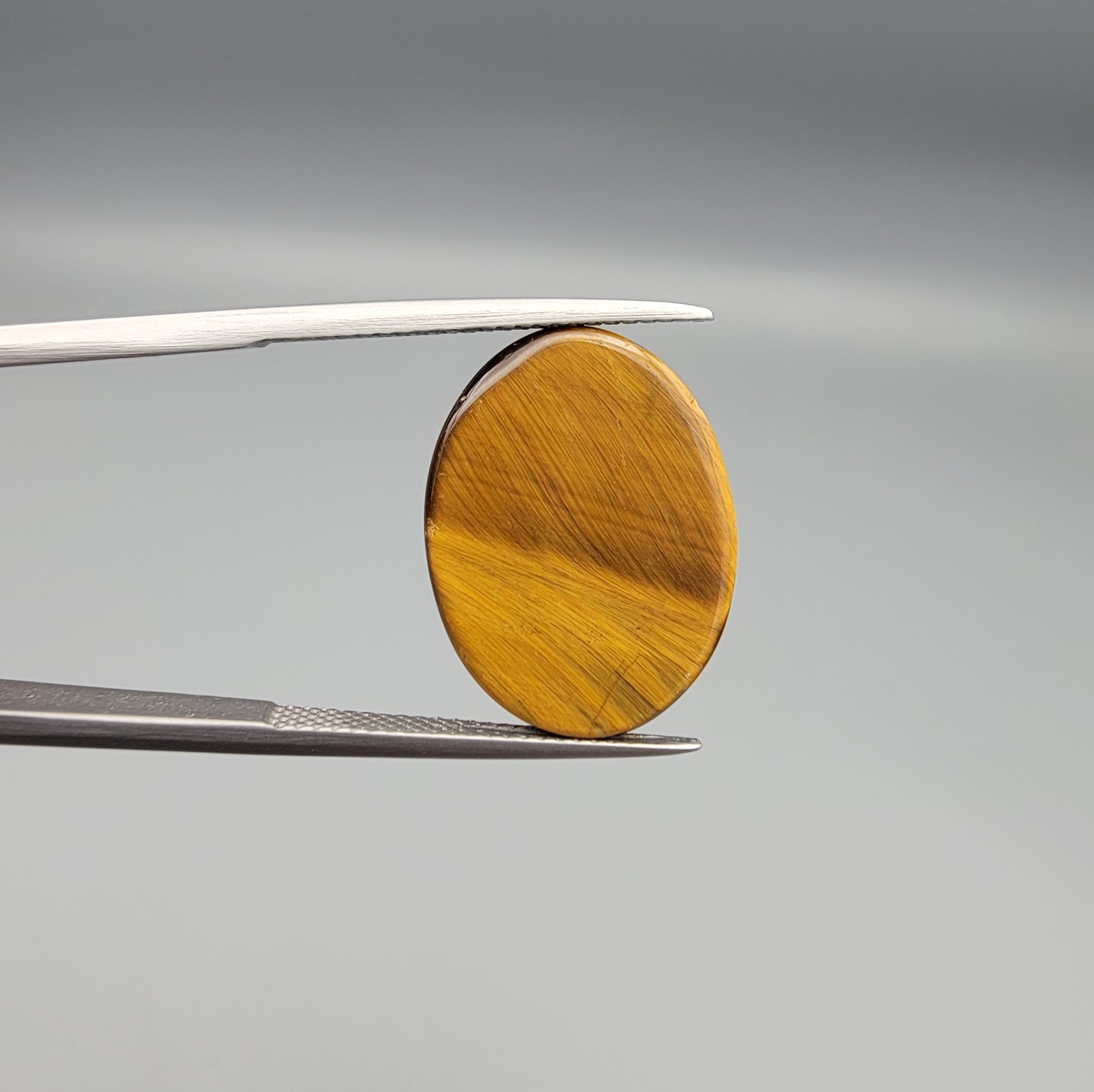​A 15.25-carat natural Golden Tiger's Eye oval cabochon with high-intensity chatoyancy and deep honey-brown banding, held in jeweler's tweezers.