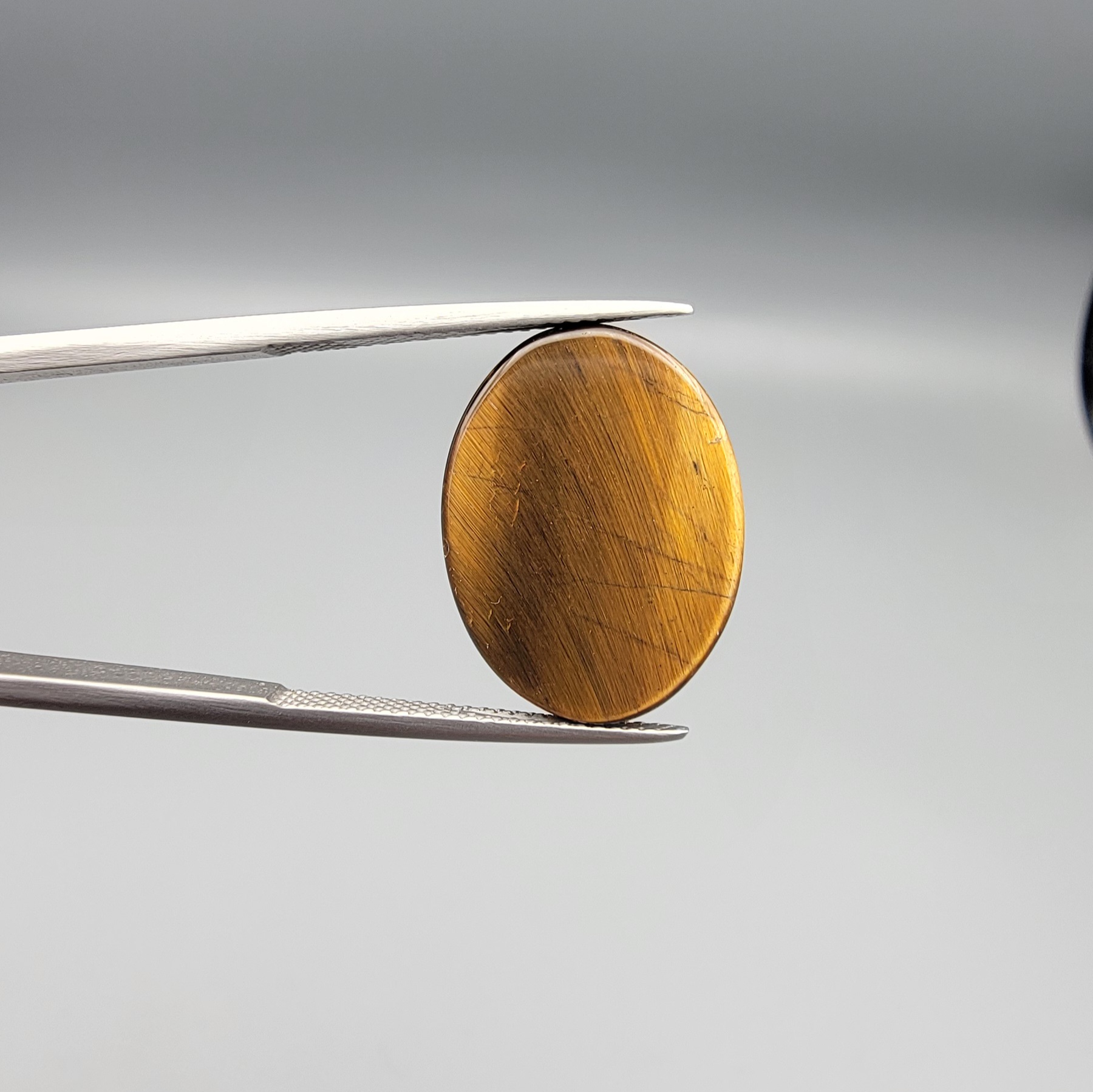 ​A 15.17-carat natural Golden Tiger's Eye oval cabochon with high-luster chatoyant bands and rich earthy brown tones, held in jeweler's tweezers.