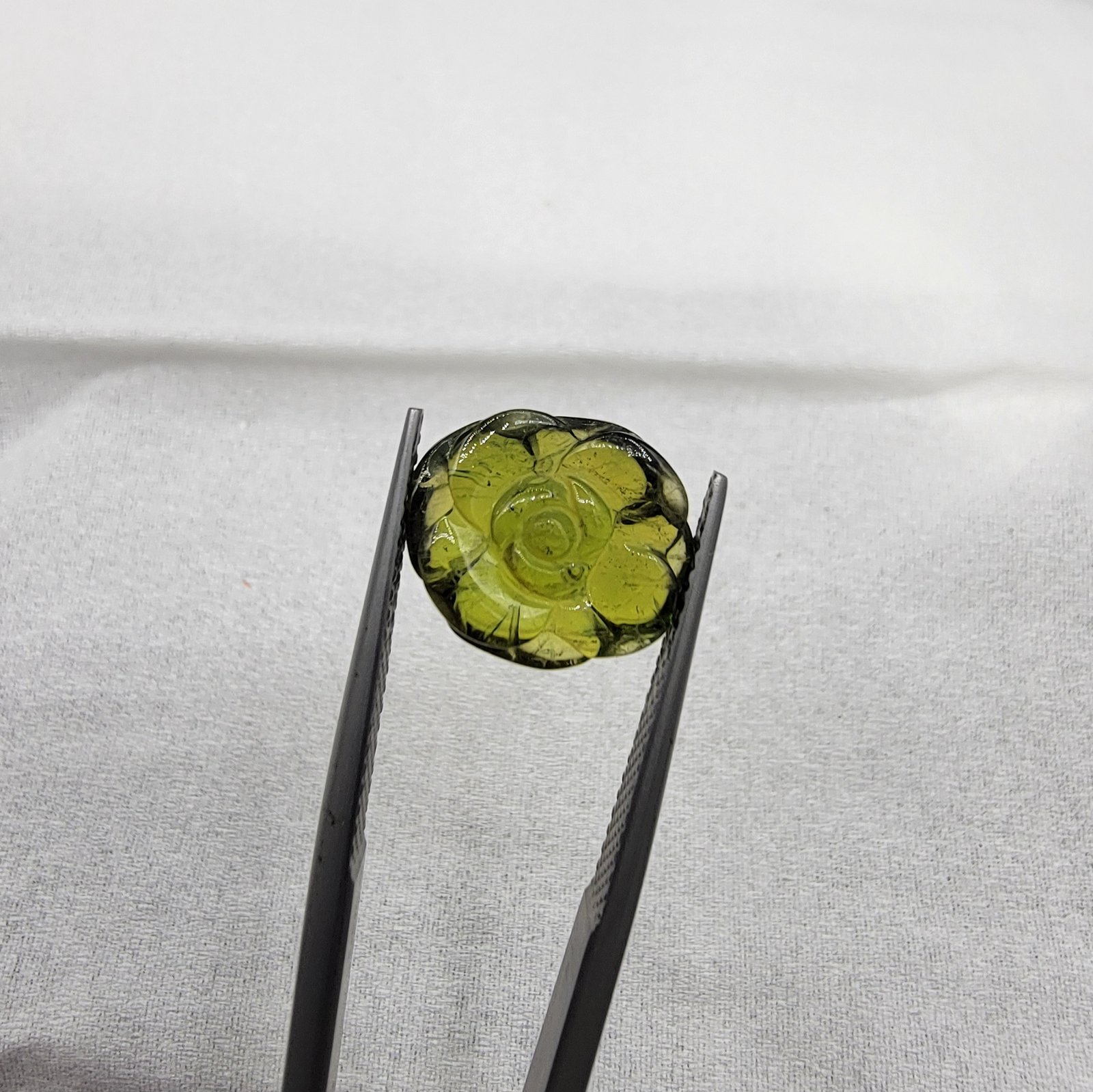 A beautifully hand-carved Natural Green Tourmaline, weighing 4.40 carats, crafted in an elegant flower design symbolizing balance and vitality. This genuine African-origin gemstone displays a lively green tone with natural inclusions that highlight its authenticity and natural formation. Perfect for gemstone collectors, jewelry artisans, or as a meaningful gift.
