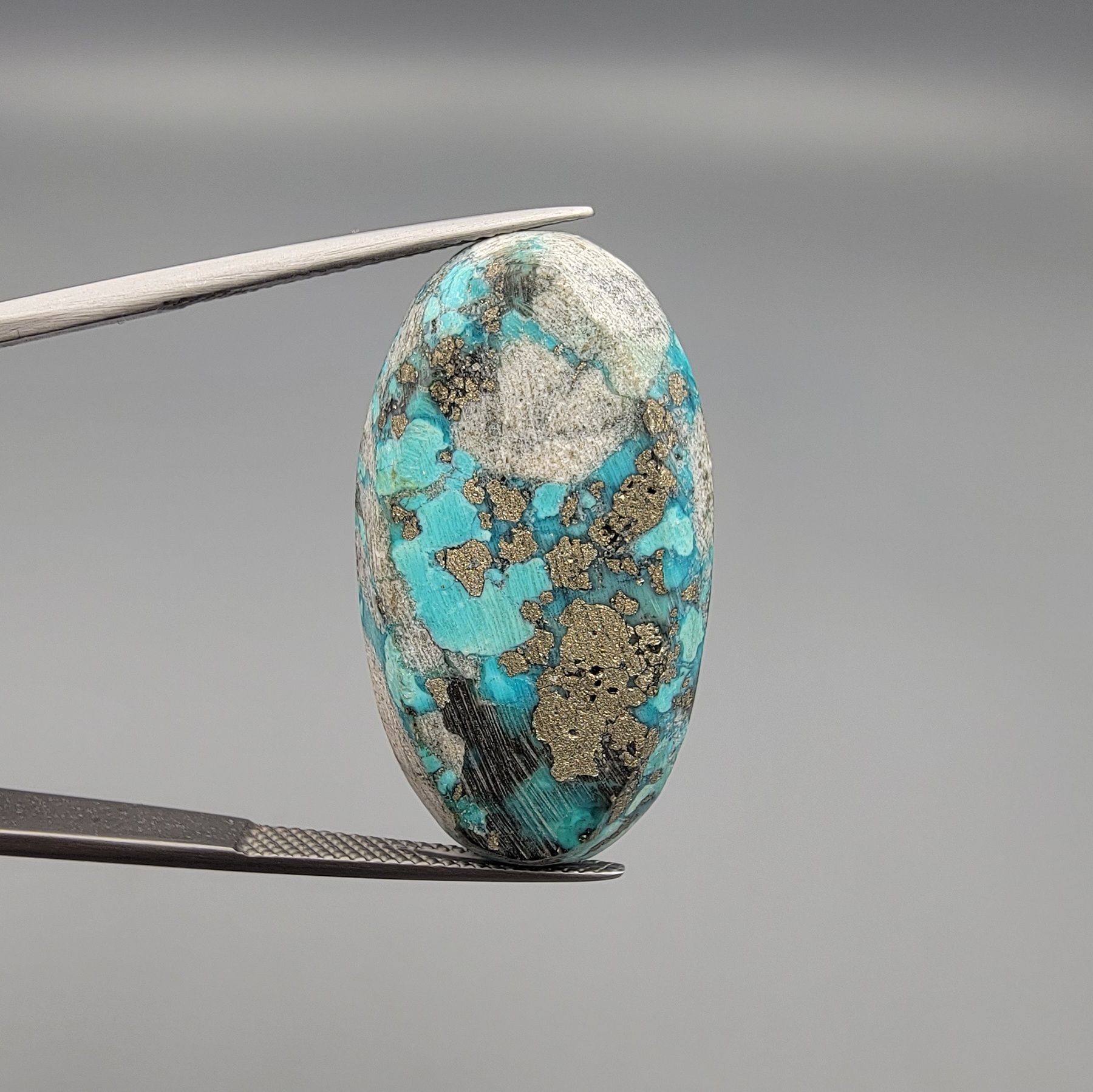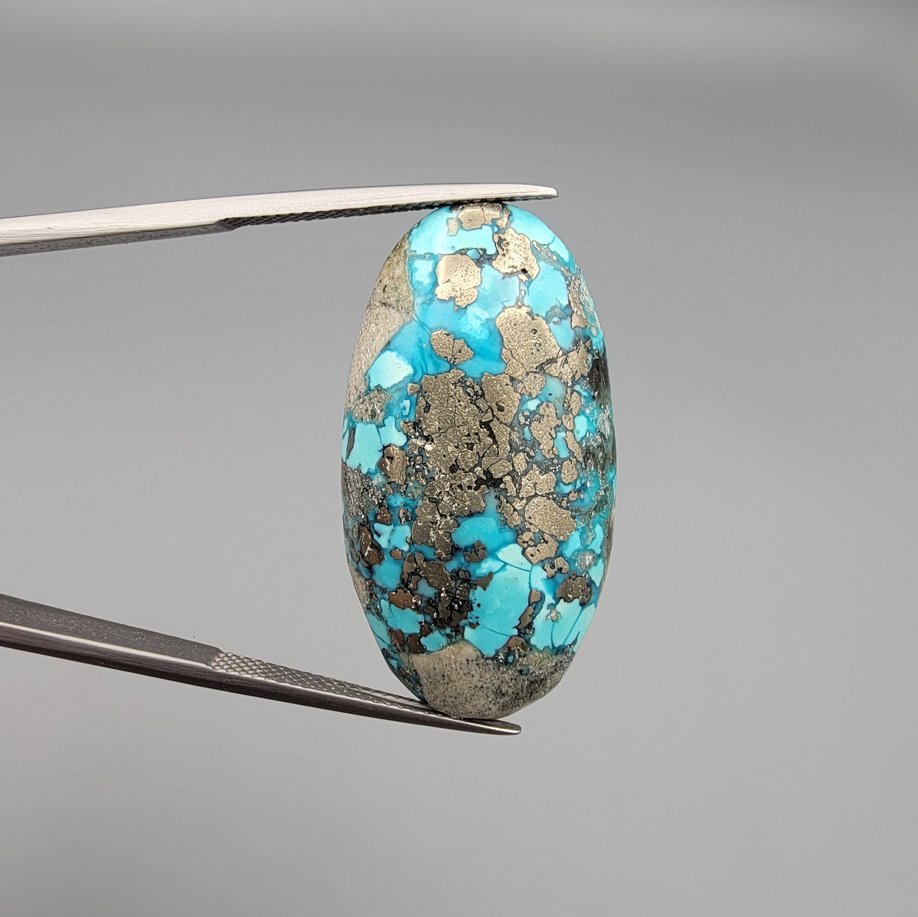 Command attention with this extraordinary 45.87-carat Natural Turquoise (Feroza) sourced from the mineral-rich landscapes of Kerman City, Iran. This oversized specimen is a true collector’s prize, featuring a deep blue-green body heavily interlaced with a natural golden pyrite matrix. The pyrite not only adds a beautiful metallic shimmer but also serves as a hallmark of its 100% natural, untreated origin. Expertly shaped into a Substantial Oval, this stone is ideally suited for a massive statement ring, a traditional heirloom pendant, or as a centerpiece in a professional mineral showcase.