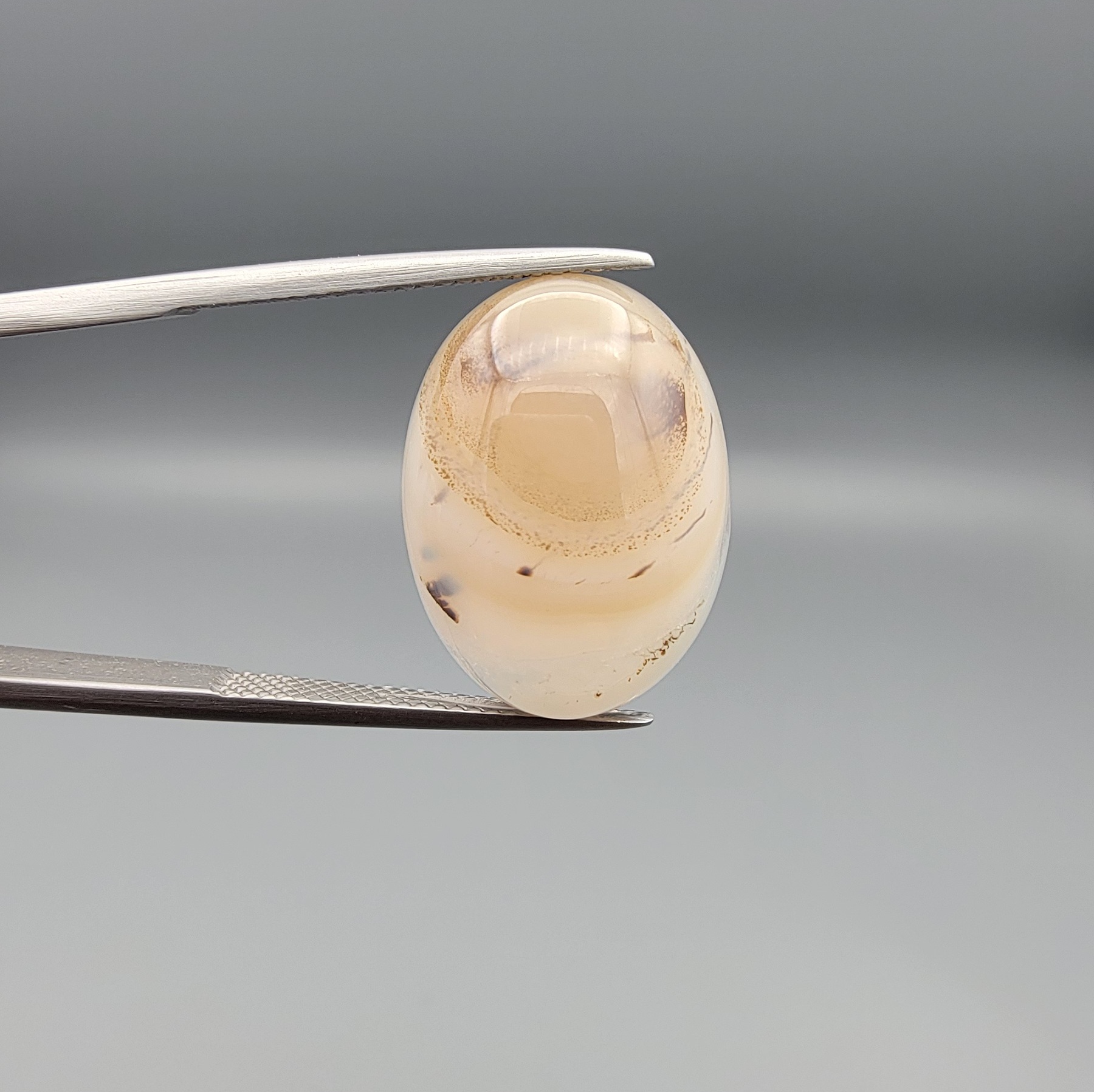 Discover a rare color story with this 15.60-carat Natural Milky Dendritic Agate. Sourced from the premium mines of Iran, this Shajari Dudhiya Aqeeq is a standout piece for collectors who appreciate natural contrast. The front side glows with a light honey-yellow tint, while the back side remains a classic translucent milky white. Floating between these layers is a single, crisp layer of black dendritic inclusions that mimic the silhouette of a solitary tree in winter. Masterfully polished into a symmetrical Oval Cabochon, this 100% natural and untreated gem is a perfect centerpiece for a custom sterling silver ring or a high-end spiritual talisman.