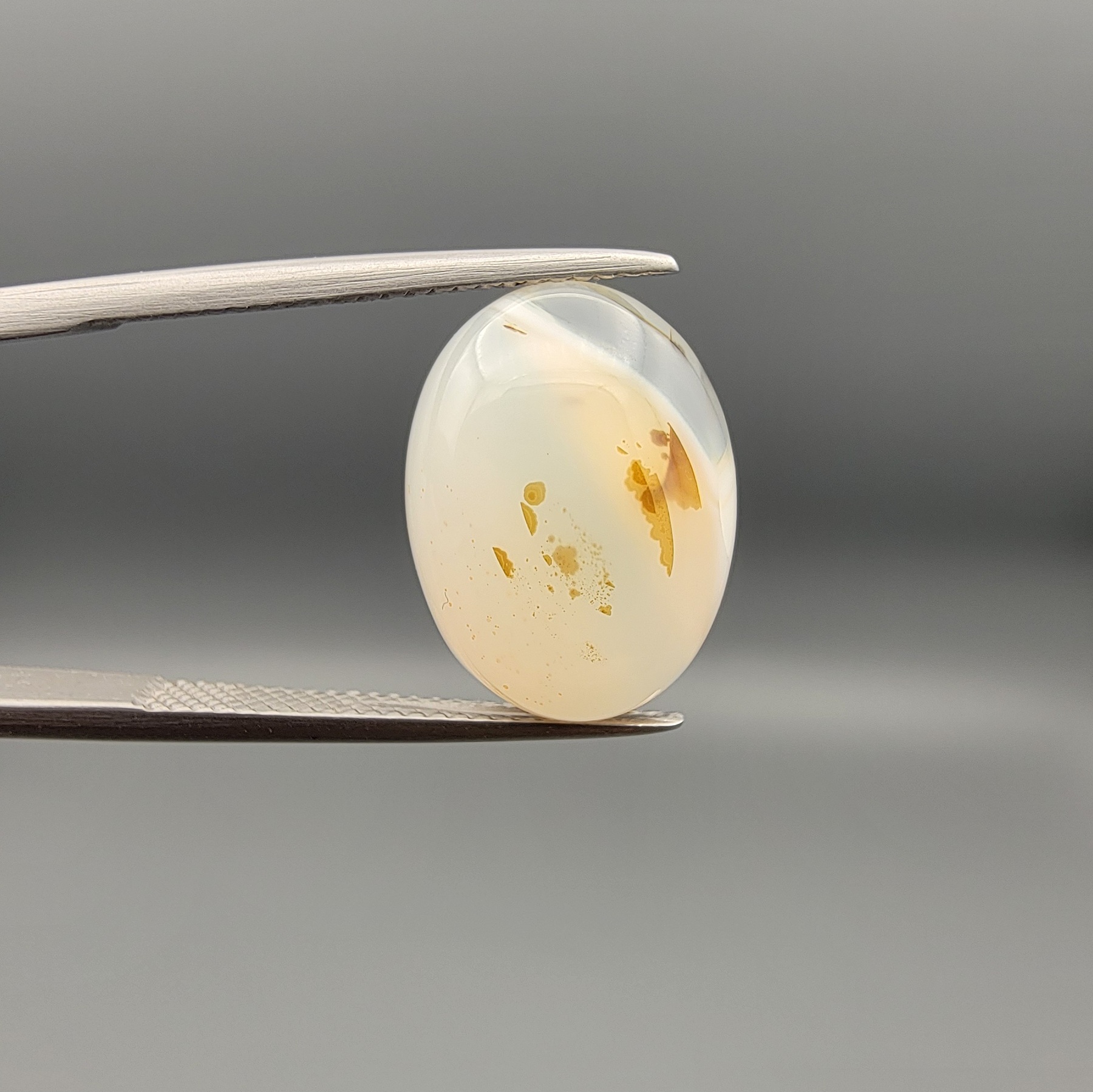 Discover the refined beauty of this 7.98-carat Natural Milky Dendritic Agate. Sourced from the premium deposits of Iran, this authentic Shajari Dudhiya Aqeeq is prized for its soft tones and organic composition. The stone showcases unique light brown layers of dendritic inclusions that resemble a peaceful autumn forest. These natural patterns are masterfully preserved on both the front and back surfaces, providing a beautiful multi-dimensional look. Polished into a symmetrical Oval Cabochon, this 100% natural gem is a perfect choice for a custom sterling silver ring or a delicate protective pendant.