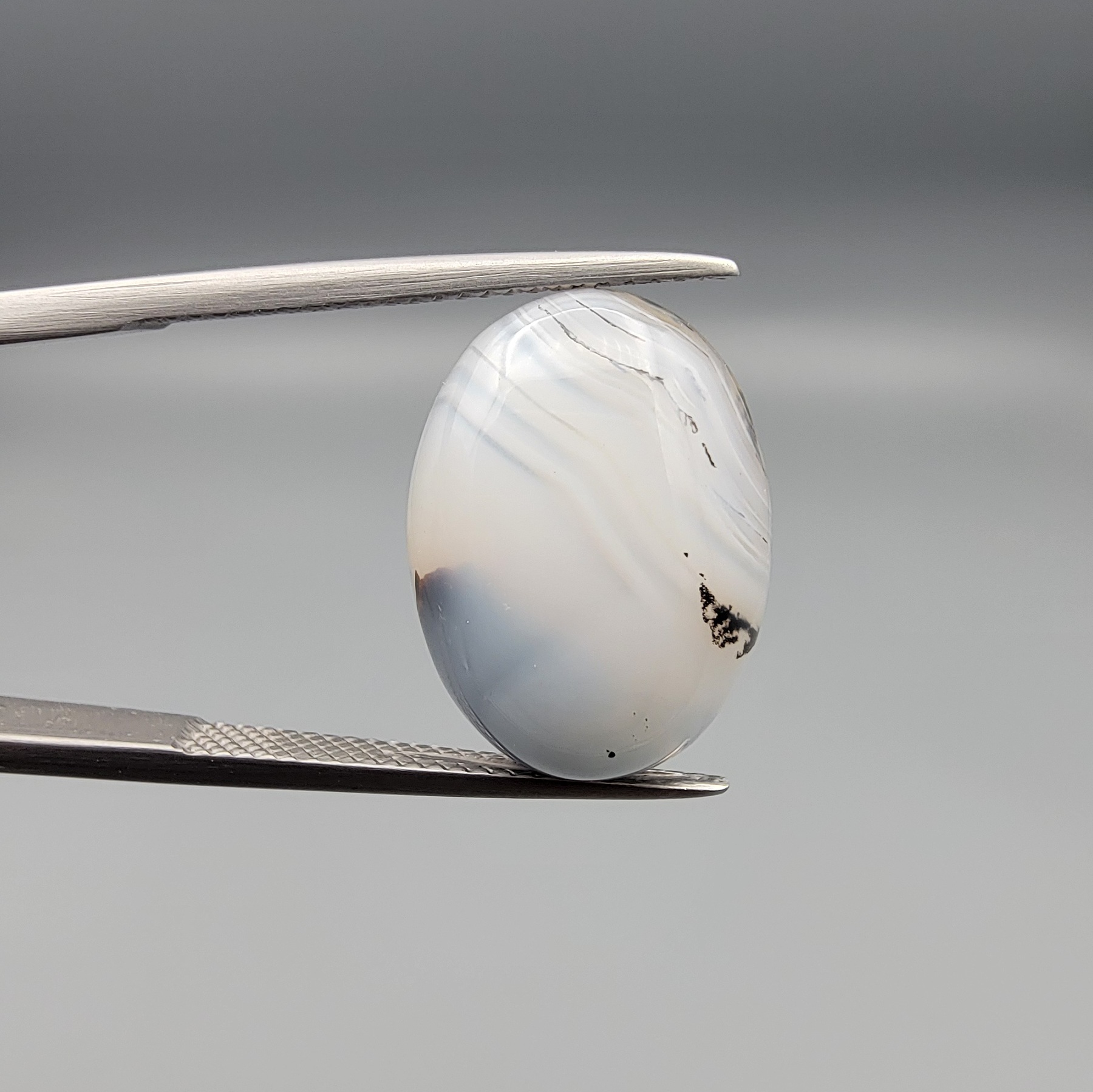 Discover the striking contrast of Persian minerals with this 10.13-carat Natural Milky Dendritic Agate (Shajari Dudhiya Aqeeq). Sourced from the mineral-rich earth of Iran, this gemstone is prized for its “Dudhiya” quality—a soft, glowing white translucency that provides the perfect backdrop for its internal art. What makes this specimen stand out is the Double-Sided Detail: both faces are decorated with sharp, naturally formed black dendritic lines that mimic the appearance of a sprawling winter forest. 100% earth-mined and untreated, this oval cabochon is a sophisticated choice for a reversible pendant, a signature ring, or a specialized landscape agate collection.