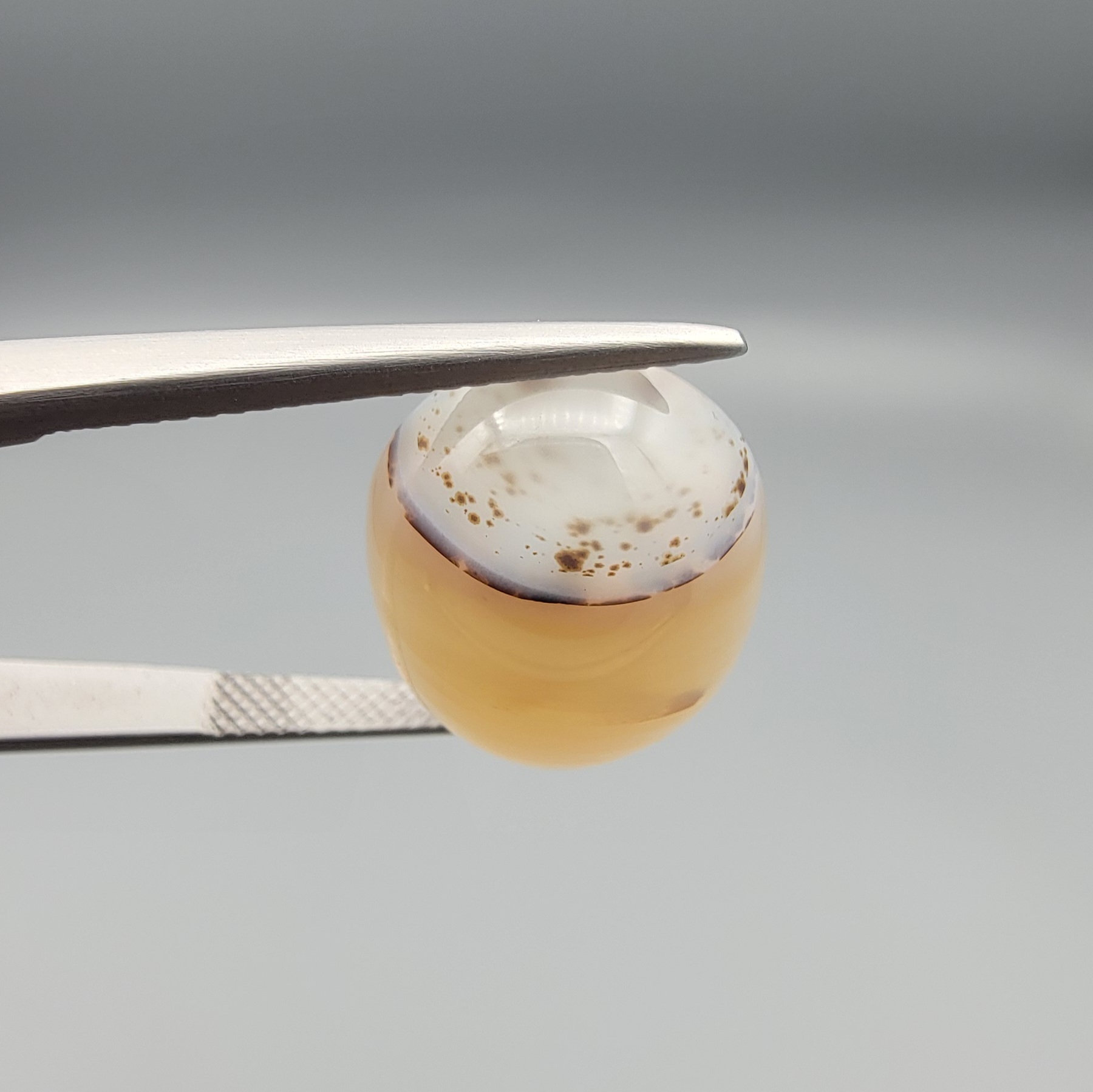 Discover a rare variation of Persian agate with this 14.24-carat Natural Milky Dendritic Agate (Shajari Dudhiya Aqeeq). Sourced from the mineral-rich landscapes of Iran, this specimen stands out due to its soft honey-comb color undertone, a warm departure from the traditional cool white Dudhiya varieties. The stone features crisp, dark dendritic formations that resemble ancient, miniature trees sprawling across a sun-drenched sky. Entirely earth-mined and untreated, this oval cabochon is an ideal choice for a sophisticated statement ring, a custom heirloom pendant, or a specialized landscape agate collection.
