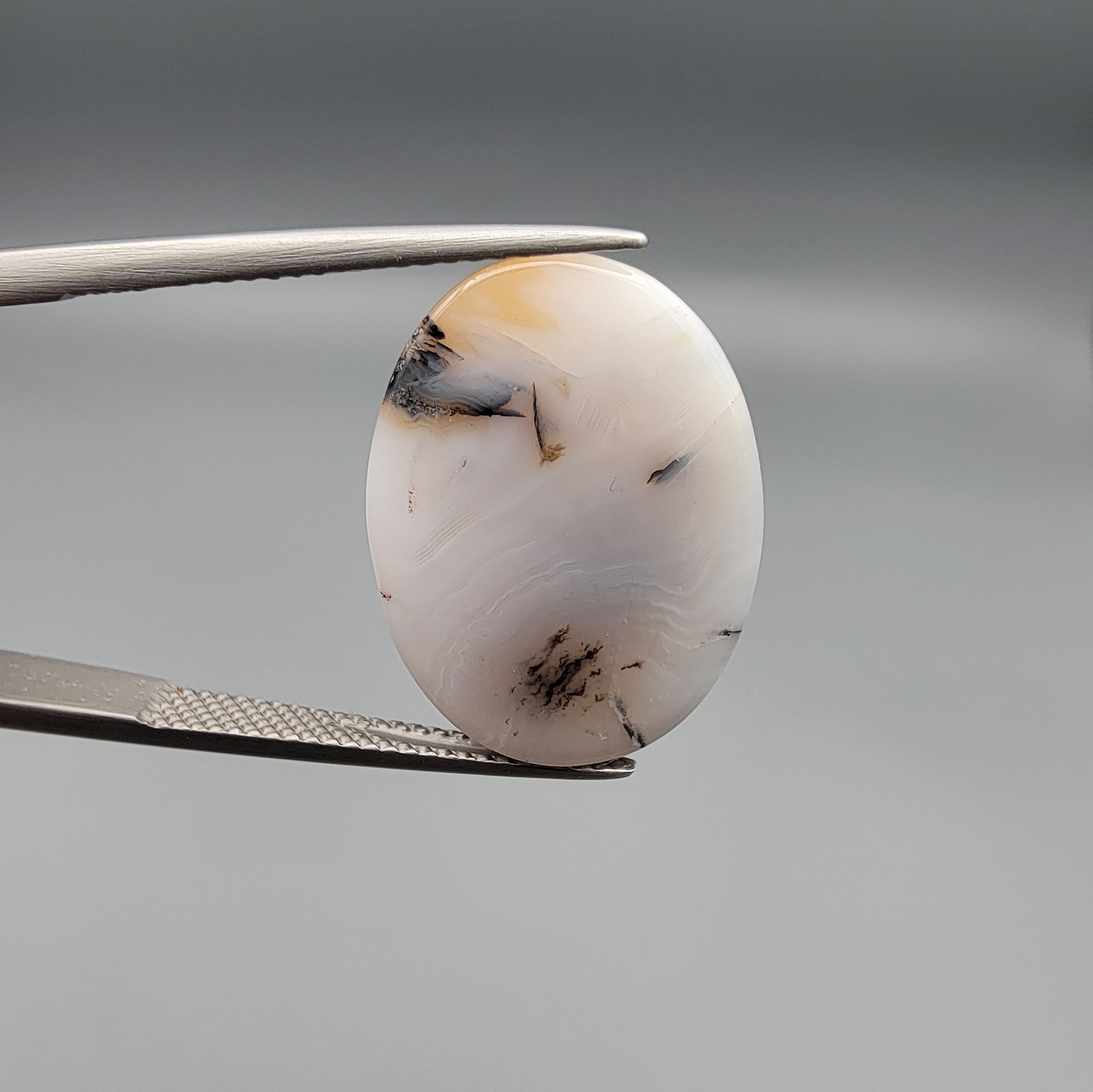 Experience the tranquil beauty of the Iranian highlands with this 15.36-carat Natural Milky Dendritic Agate (Shajari Dudhiya Aqeeq). This collector-grade gemstone is highly prized for its “Dudhiya” quality—a soft, milky-white translucency that gives the stone a unique internal glow. Within its depths lie exquisite dendritic inclusions that have naturally branched out into the shape of miniature trees or ancient moss. Entirely earth-mined and untreated, this Persian Agate is polished into a smooth, symmetrical cabochon. Its scenic “landscape” appearance makes it a one-of-a-kind choice for a bespoke statement ring, a meditative pendant, or a specialized mineral collection.