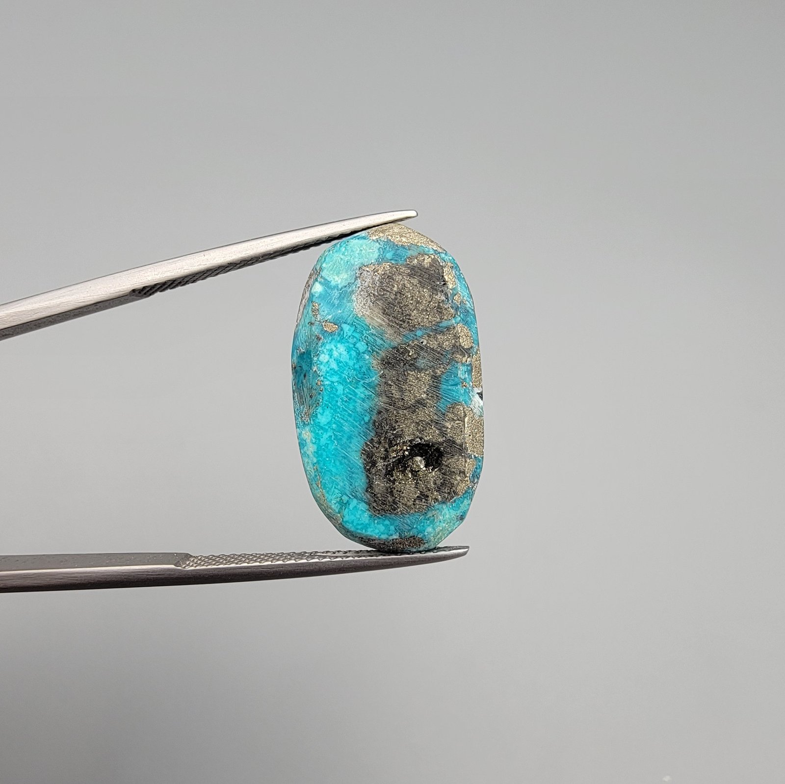 Elevate your jewelry collection with this 20.58-carat Natural Iranian Turquoise (Feroza) sourced from the famous deposits of Kerman City. This stone is prized for its saturated Sky Blue hue and the presence of natural metallic pyrite, a hallmark of premium Iranian turquoise that ensures its authenticity. Expertly polished into a balanced Oval Cabochon, its size is perfectly suited for a sophisticated men’s ring or a striking unisex pendant. As an earth-mined stone from a legendary origin, it carries both aesthetic beauty and traditional spiritual significance.