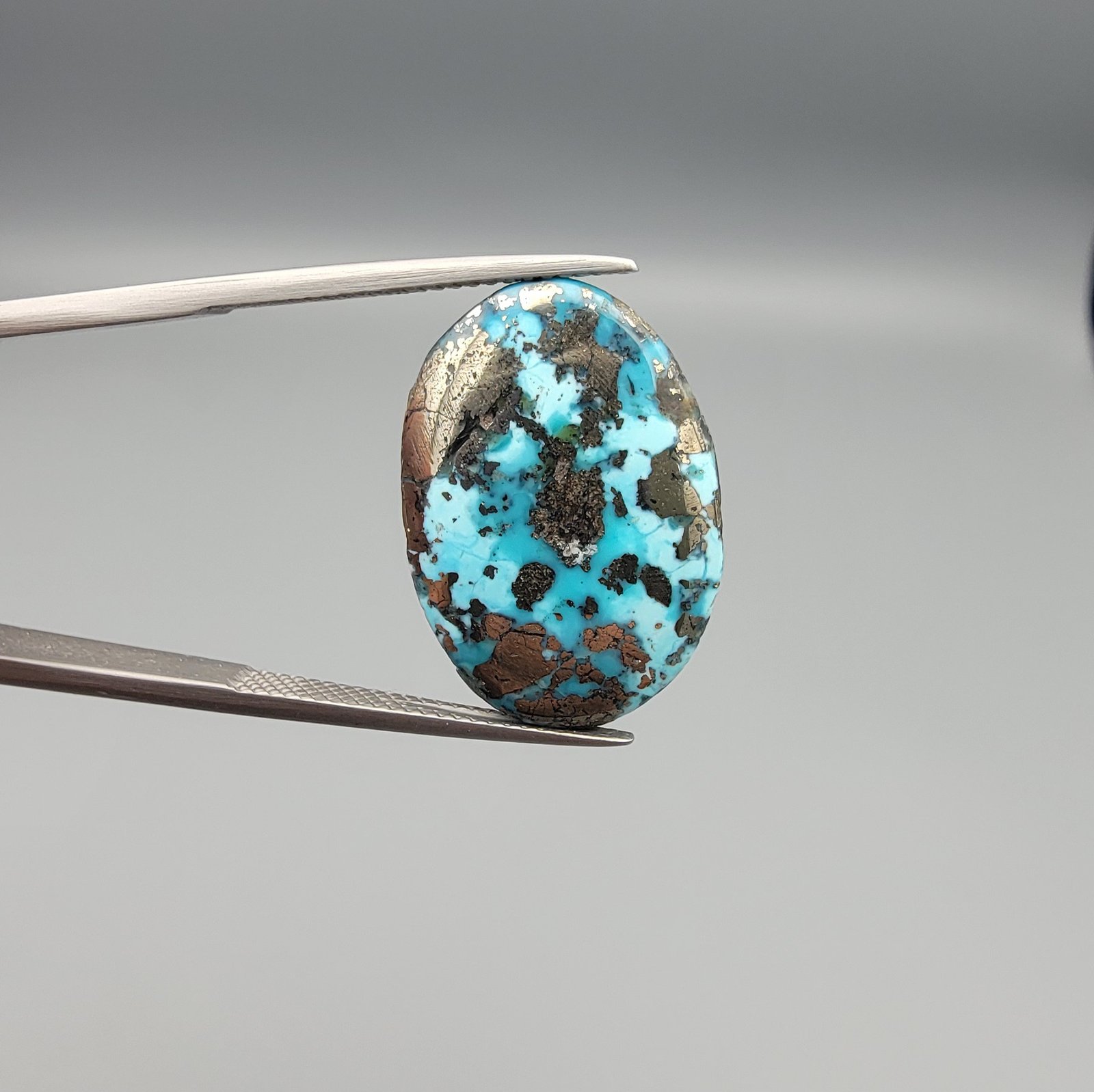 Capture the essence of high-altitude Persian mines with this 24.62-carat Natural Iranian Turquoise (Feroza) from Kerman City. This gemstone is highly sought after for its distinctive Sky Blue hue and the brilliant natural pyrite matrix that provides a golden luster to the stone. Hand-polished into a substantial Oval Cabochon, it offers a smooth, high-gloss surface perfect for a premium men’s ring or a luxury pendant. Authentic and earth-mined, this Kerman stone is a true collector’s item with a powerful aesthetic and heritage.