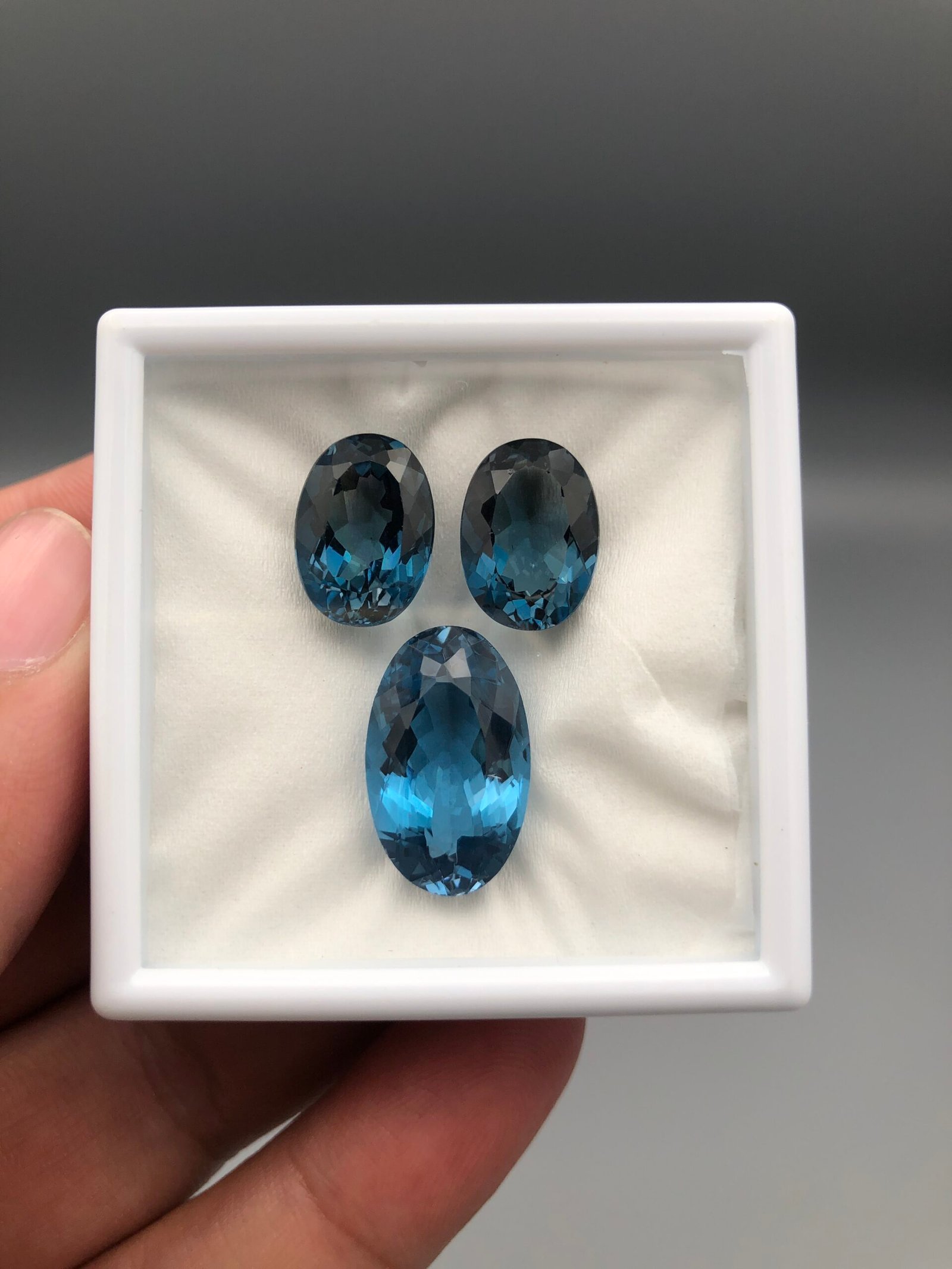 Presenting a rare opportunity for complete design harmony: a 29.45-carat total weight suite of natural London Blue Topaz, featuring three perfectly calibrated oval gemstones. This deluxe collection is curated for the discerning jeweler, providing a symmetrical pair for statement earrings and a substantial third oval for a matching pendant or necklace focal point. Each stone exhibits the deep, velvety teal-blue saturation that defines the “London Blue” variety, paired with exceptional transparency and a brilliant faceting pattern that maximizes light return. Unify your luxury collection with this authentic, professionally matched suite of one of the world’s most coveted blue gemstones.