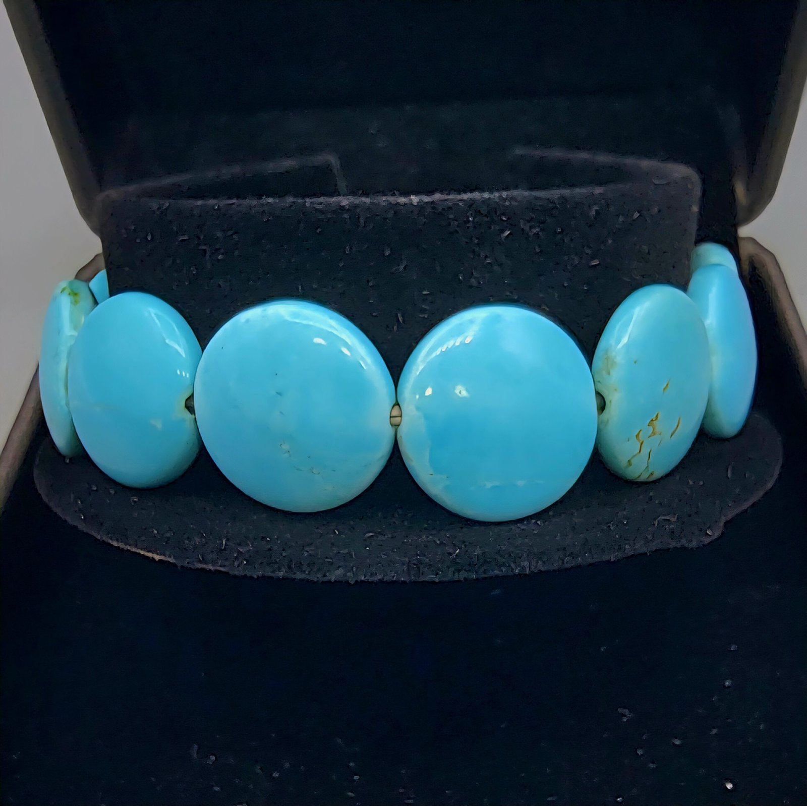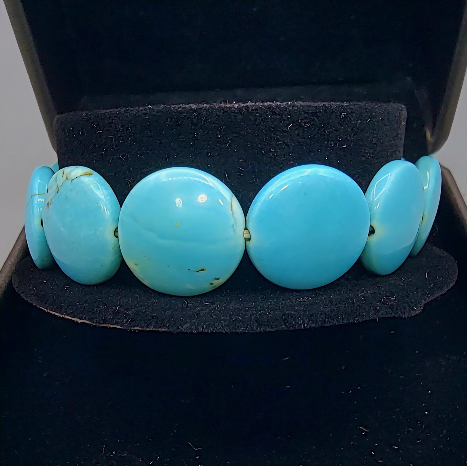 A magnificent and substantial 148.35-carat natural turquoise bracelet, featuring large, polished oval/coin-shaped beads. sought-after vibrant blue color with natural matrix (veining) that proves its authenticity. This is a bold, high-quality statement piece with powerful traditional benefits, known as a symbol of protection and luck