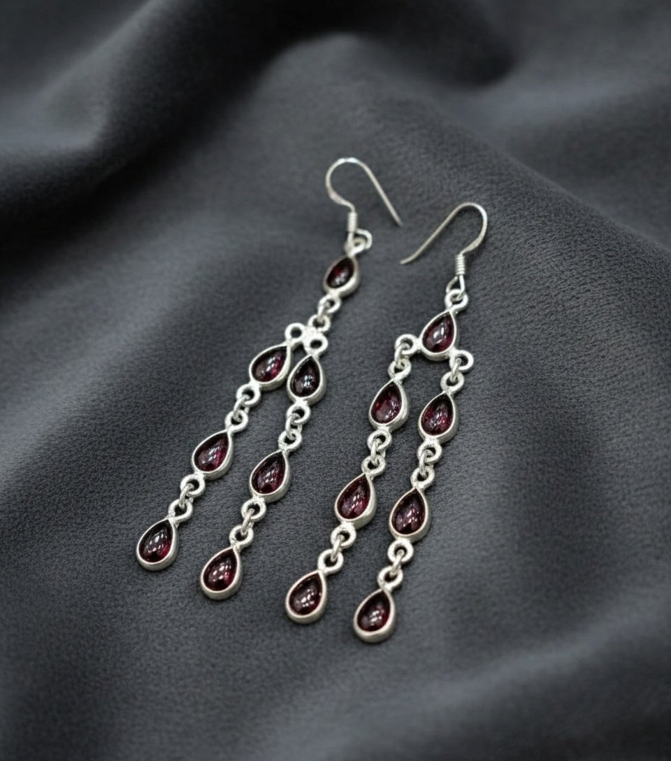 Striking and sophisticated, these Natural Red Garnet Dangle Earrings are crafted in pure 925 Sterling Silver with cascading pear-shaped cabochons. Featuring deep wine-red garnets sourced from Africa, the elegant chandelier design creates a flowing, graceful silhouette perfect for evening wear or special occasions. Hand-set and polished, these earrings blend timeless luxury with raw natural beauty — a radiant addition to any collection.