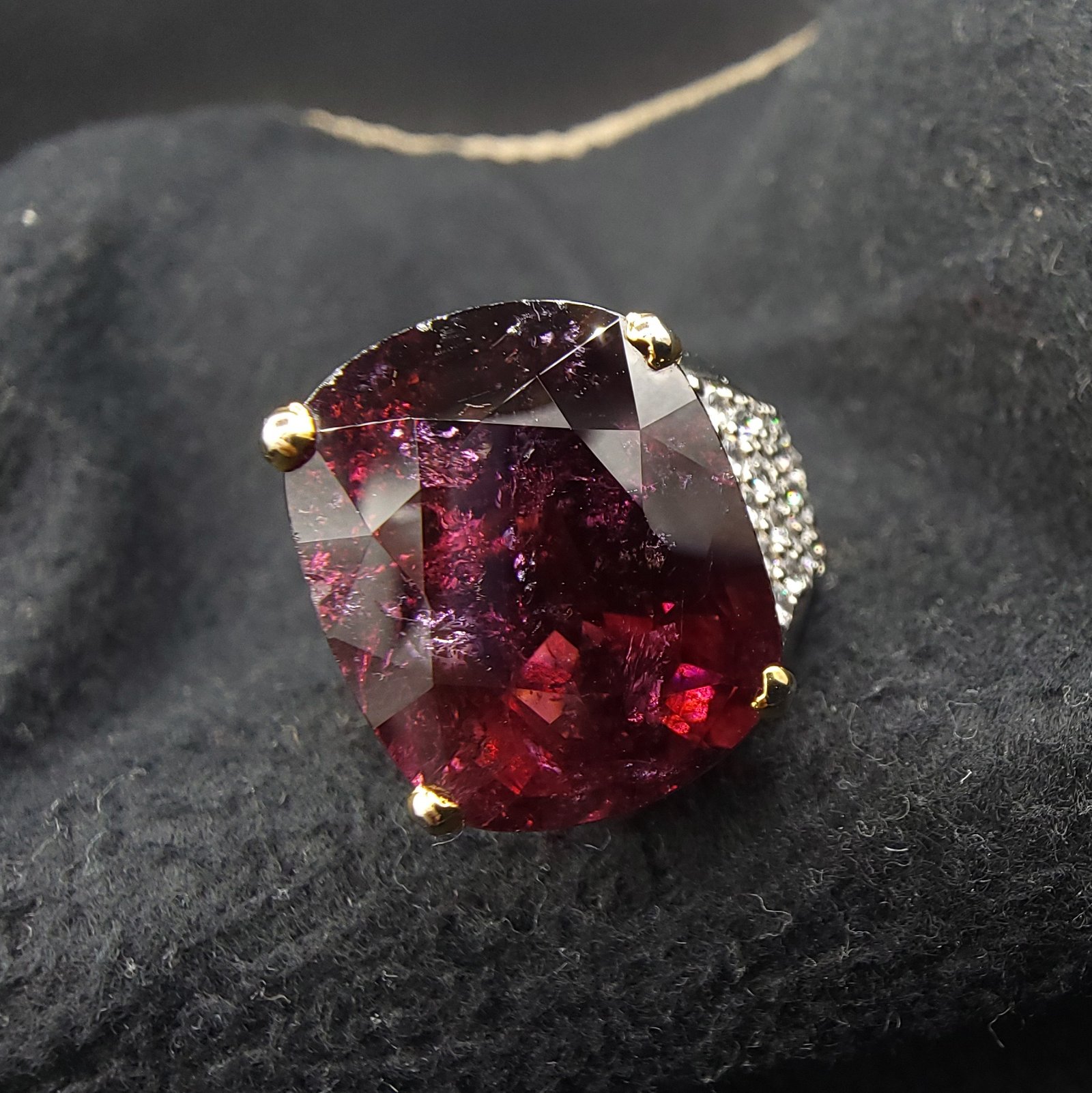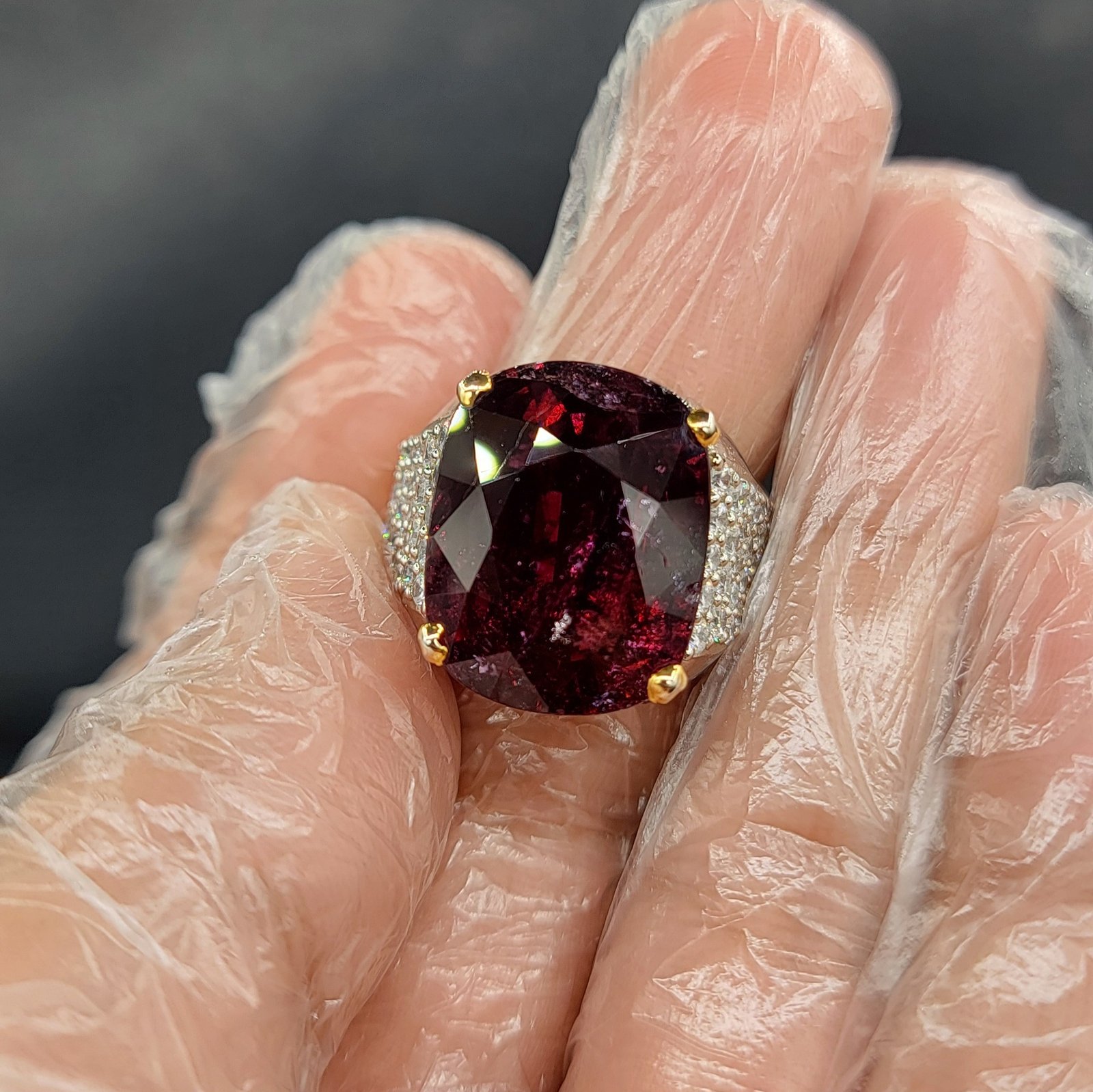 This magnificent ring features a genuine Natural Rubellite Tourmaline sourced from the renowned mines of Mozambique. Weighing an impressive 23 carats, this vibrant, deep pink-to-red gemstone is beautifully set in a lustrous sterling silver band. This exquisite piece of fine jewelry is perfect as a statement piece, a special gift, or a valuable addition to any high-end collection.