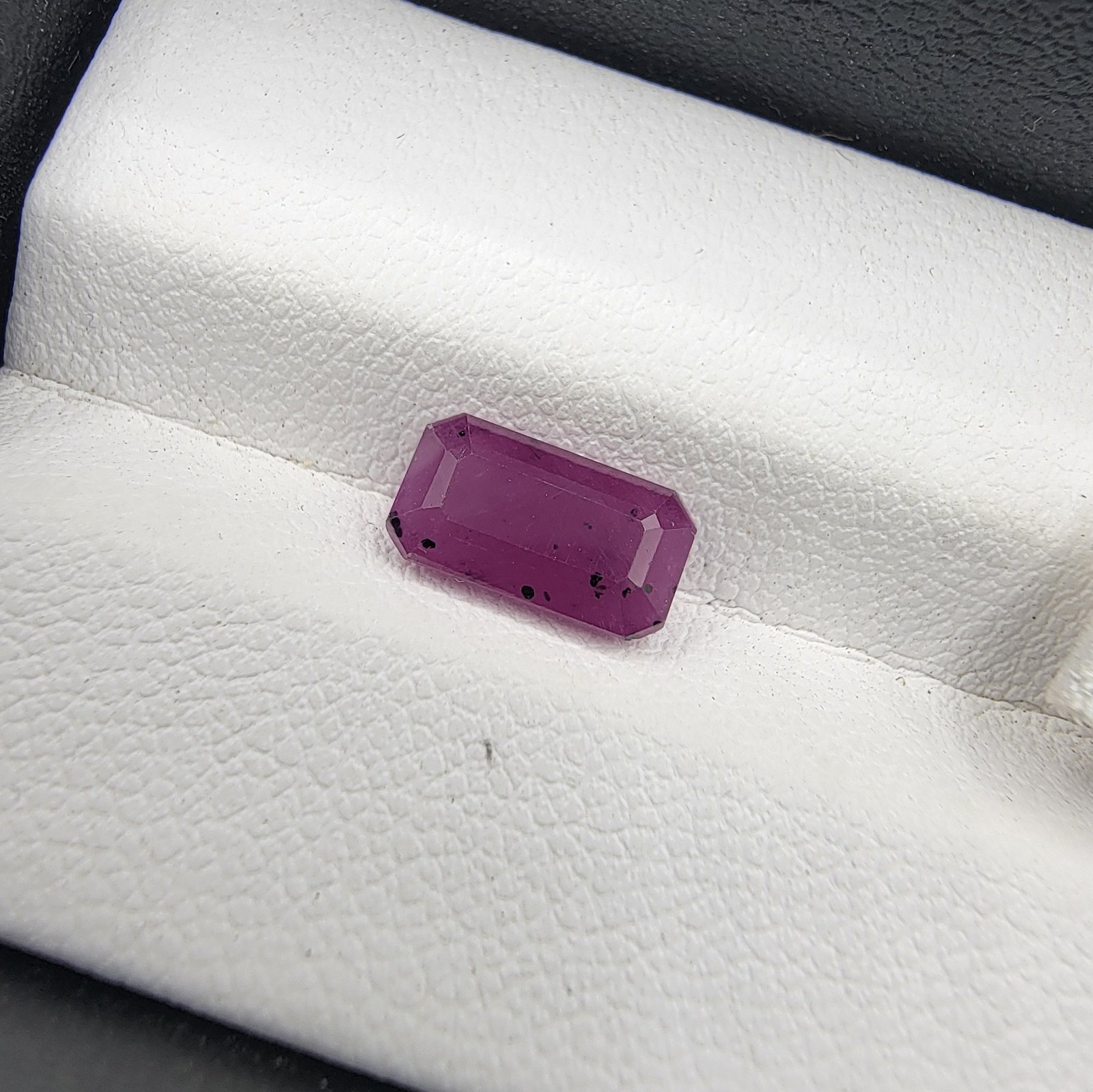 This Natural Ruby from Mozambique, weighing 2.60 carats, displays a rich, deep red color with visible natural inclusions that confirm its authenticity. Cut in a classic Emerald shape, this ruby stands out with strong saturation, elegant proportions, and a glowing presence—ideal for high-end jewelry or collectors looking for a larger, natural ruby gemstone.