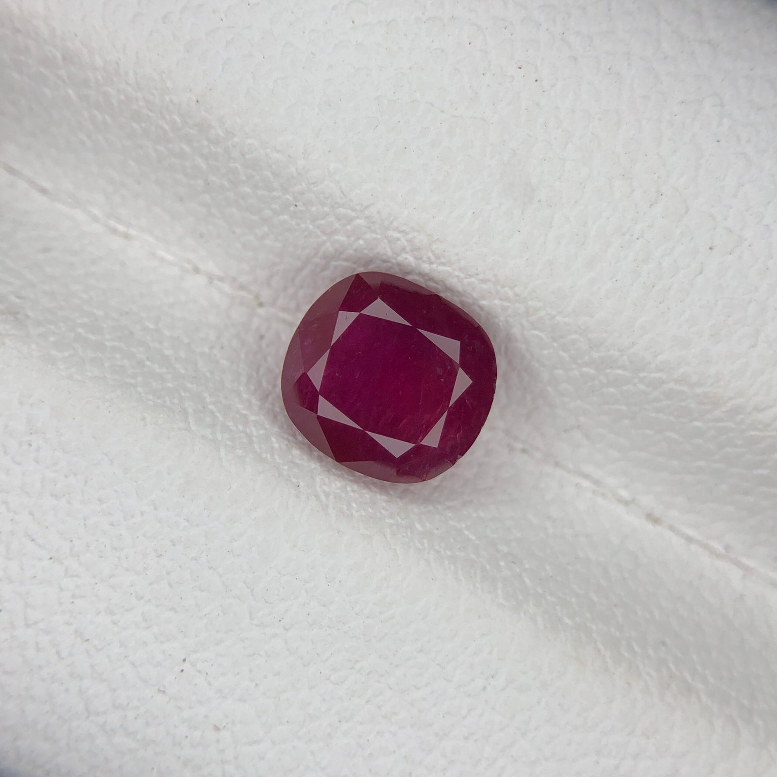 A highly sought-after 1.85-carat natural ruby, sourced from the premium mines of Mozambique. This gemstone has been certified by the Galaxy Gemological Institute (GGI Report #KHI2512920611) with ‘no evidence of enhancement found,’ confirming its rare, natural state. Its vibrant red color, semi-transparent quality, and classic cushion cut make it a valuable investment piece for bespoke jewelry.