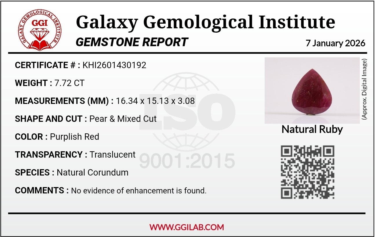 A magnificent and substantial 7.72-carat natural mozambique ruby (yaqoot). This gemstone has been certified by the Galaxy Gemological Institute (GGI Report #KHI2601430192) with ‘no evidence of enhancement found,’ confirming its rare, natural, and unheated state. Its attractive purplish-red color, translucent quality, and elegant pear shape make it a valuable investment piece for bespoke jewelry.