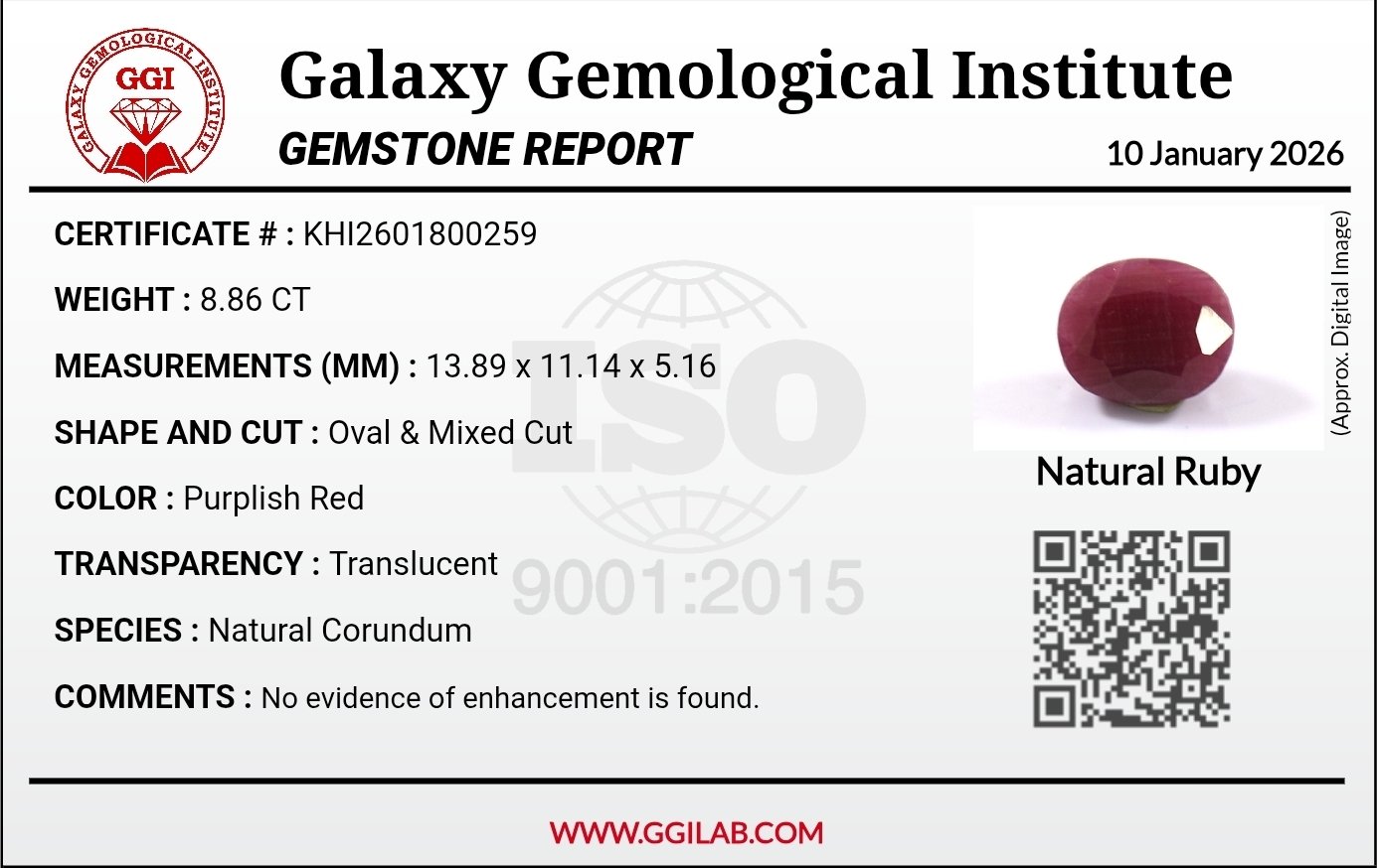 This Natural Ruby (Yaqoot) weighs 8.86 carats and comes from the renowned ruby mines of Mozambique. Cut in a cushion mixed style, the gemstone displays a rich purplish-red color with translucent clarity, reflecting its natural formation. Certified by Galaxy Gemological Institute (GGI), this ruby shows no evidence of enhancement and remains completely unheated, preserving its original beauty and authenticity. A fine choice for collectors, investors, or bespoke jewelry designs.