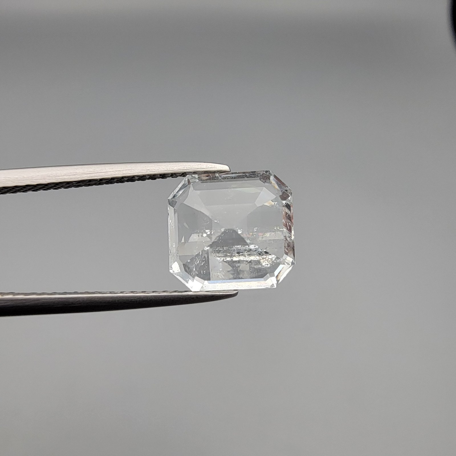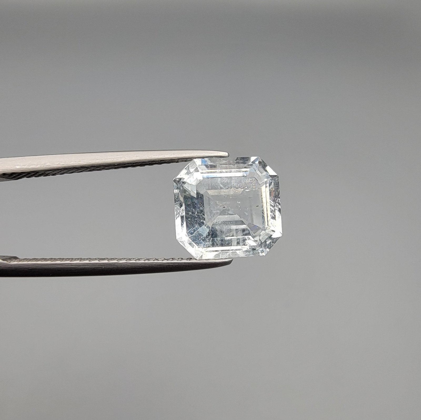 ​A 2.15-carat natural Shigar Valley Aquamarine (Beruj) gemstone with an octagon emerald cut, featuring clear sky-blue color and beautiful natural inclusions, held in jeweler's tweezers.