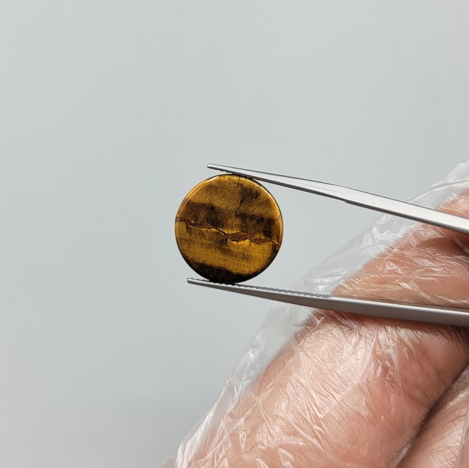Presenting a 100% natural Tiger Eye gemstone weighing 10.30 carats, cut in a smooth round cabochon to highlight its golden chatoyancy. This untreated gemstone exhibits a mesmerizing cat’s eye shimmer and a rich golden-brown tone. Perfect for custom jewelry, crystal healing, or collector’s pieces. Symbolizing strength and protection, it’s ideal for both spiritual and ornamental use.