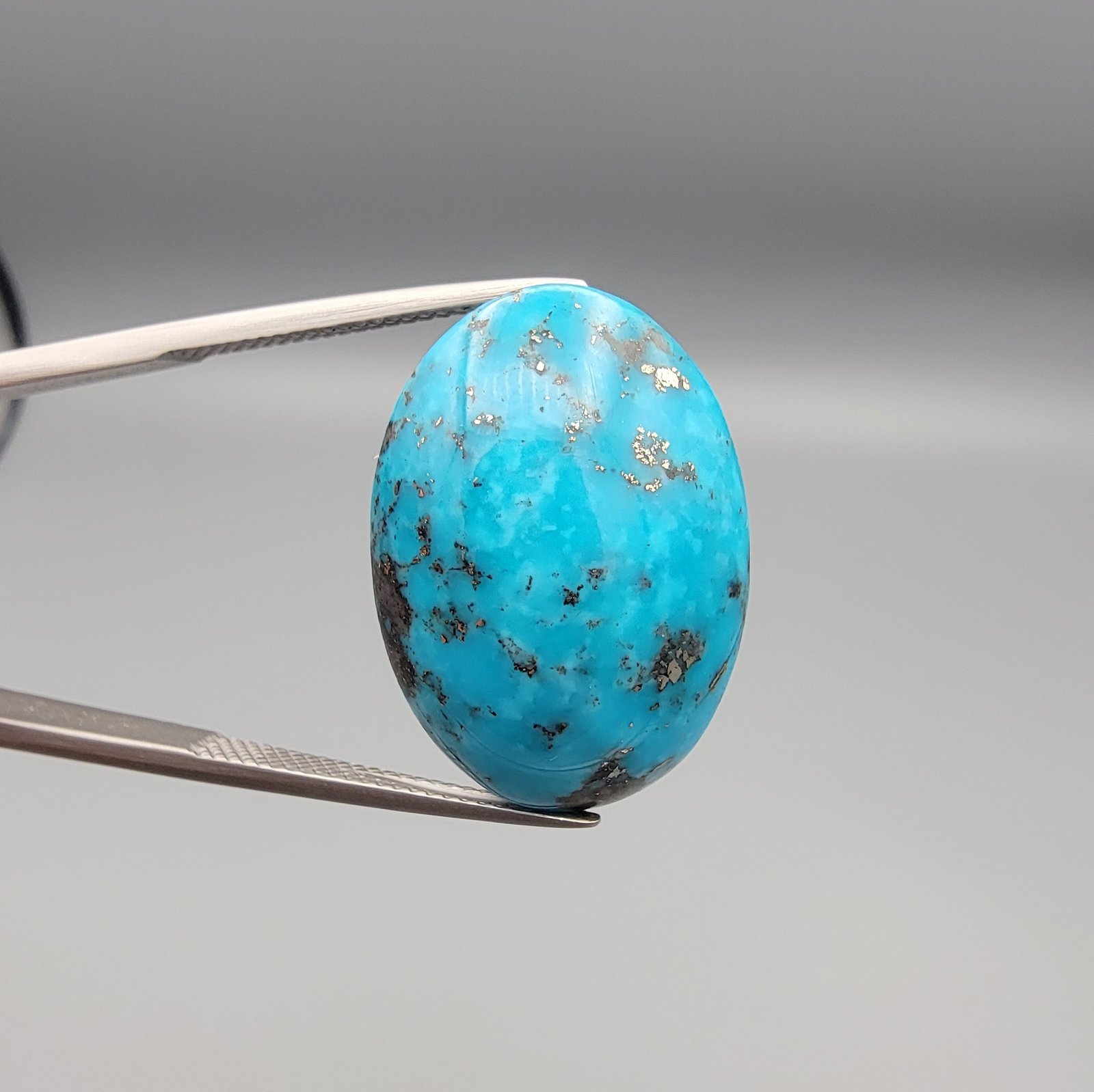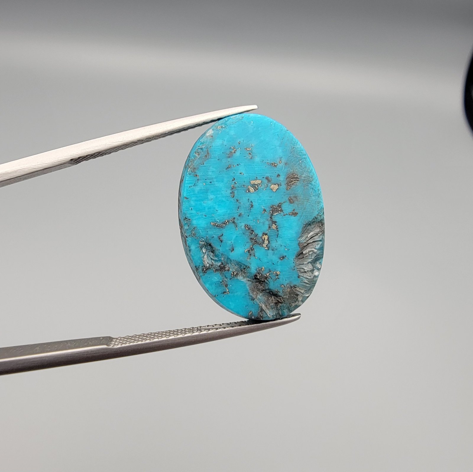 A magnificent and substantial 21.68-carat natural turquoise, known locally as Irani Feroza. Sourced from the prestigious mines of Iran, this gemstone exhibits a desirable blue color enhanced by striking natural pyrite inclusions (often appearing as gold or black matrix). These inclusions are a sign of authenticity and uniqueness, making this oval-shaped stone a true collector’s item and ideal for bespoke jewelry.