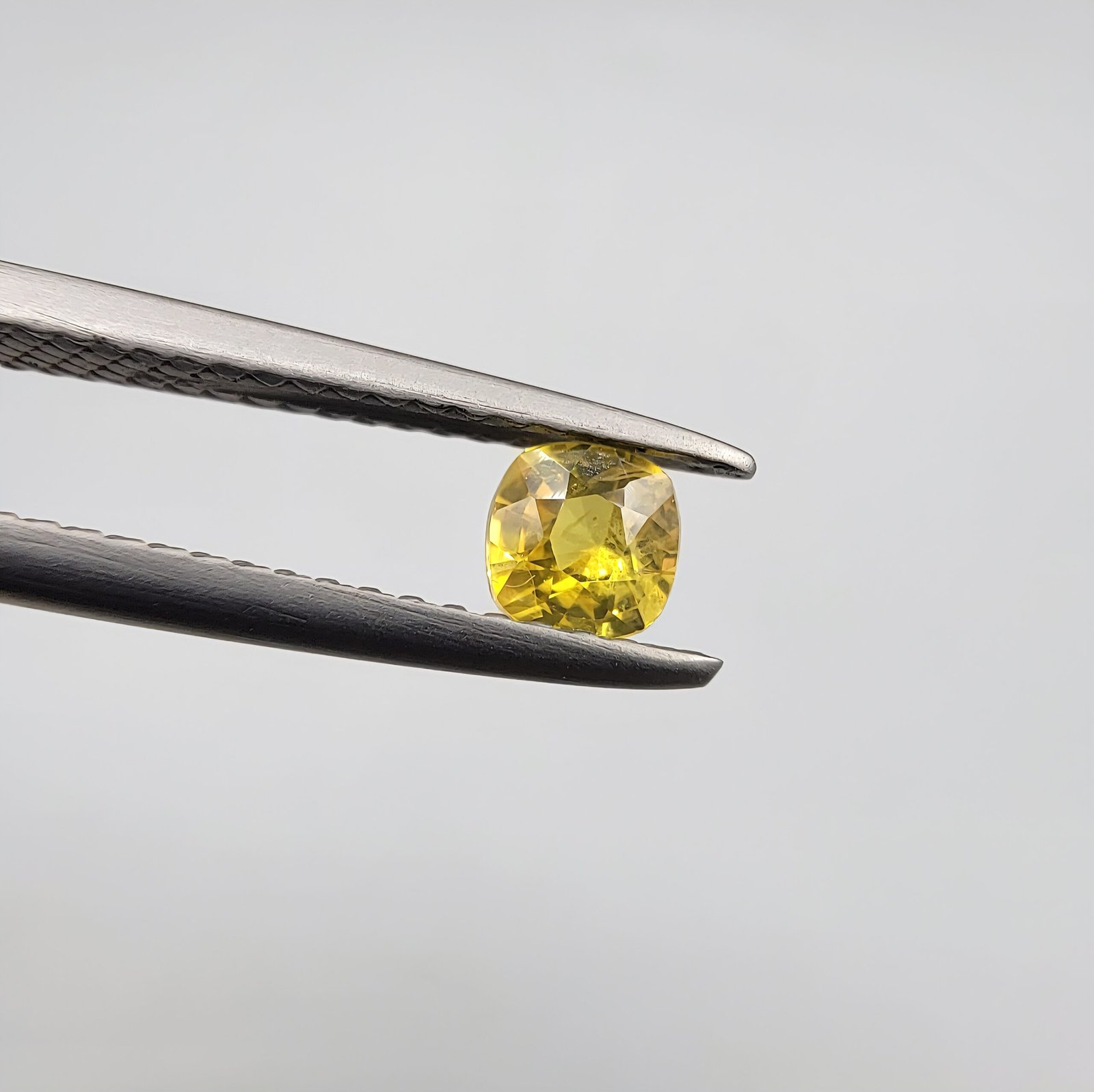 This Natural Yellow Sapphire (Pukhraj) from Madagascar, weighing 0.39 carat, displays a bright golden-yellow hue with lively brilliance and fine transparency. Expertly cushion-cut to enhance its sparkle, this gemstone symbolizes wisdom, prosperity, and good fortune. Ideal for astrological purposes or elegant jewelry, this exquisite sapphire radiates a warm, uplifting glow — a timeless piece for those who seek both beauty and meaning.