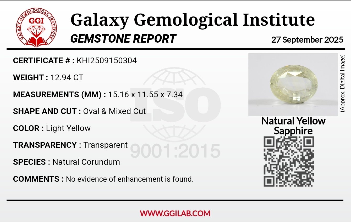 This beautiful Natural Yellow Sapphire, also known as Pukhraj, is a true masterpiece from the prestigious mines of Srilanka (Ceylon). Weighing a precise 12.94 carats, this gemstone boasts a rich, light yellow color. Its GGI Laboratory Certified and impressive size and world-renowned origin make it an exceptional choice for a high-end ring or pendant, or a valuable addition to any gemstone collection.