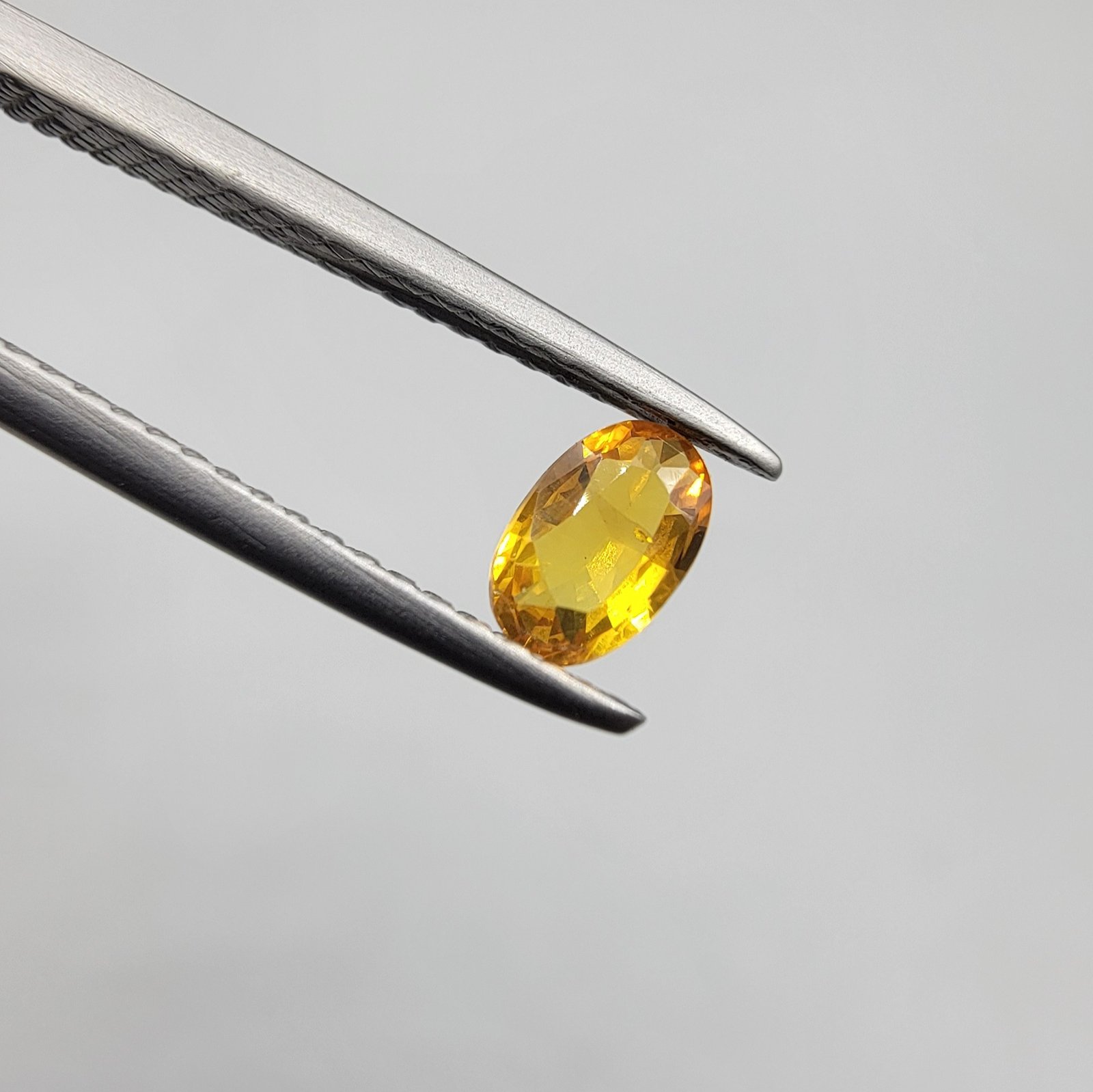 An original 0.41 carat natural yellow sapphire gemstone, prized as Pukhraj or Pushparaj in the subcontinent. This vibrant yellow specimen is sourced from the mines of Madagascar, an origin known for unique and high-quality sapphires. It features a classic oval cut which highlights its bright color and transparency. Find the best Pukhraj stone price in Karachi, Pakistan for this authentic piece.
