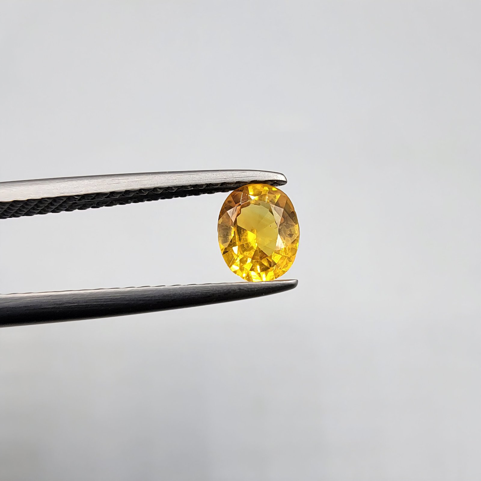 An original 0.62 carat natural yellow sapphire gemstone, prized as Pukhraj or Pushparaj in the subcontinent. This vibrant yellow specimen is sourced from the mines of Madagascar, an origin known for unique and high-quality sapphires. It features a classic oval cut which highlights its bright color and transparency. Find the best Pukhraj stone price in Karachi, Pakistan for this authentic piece.