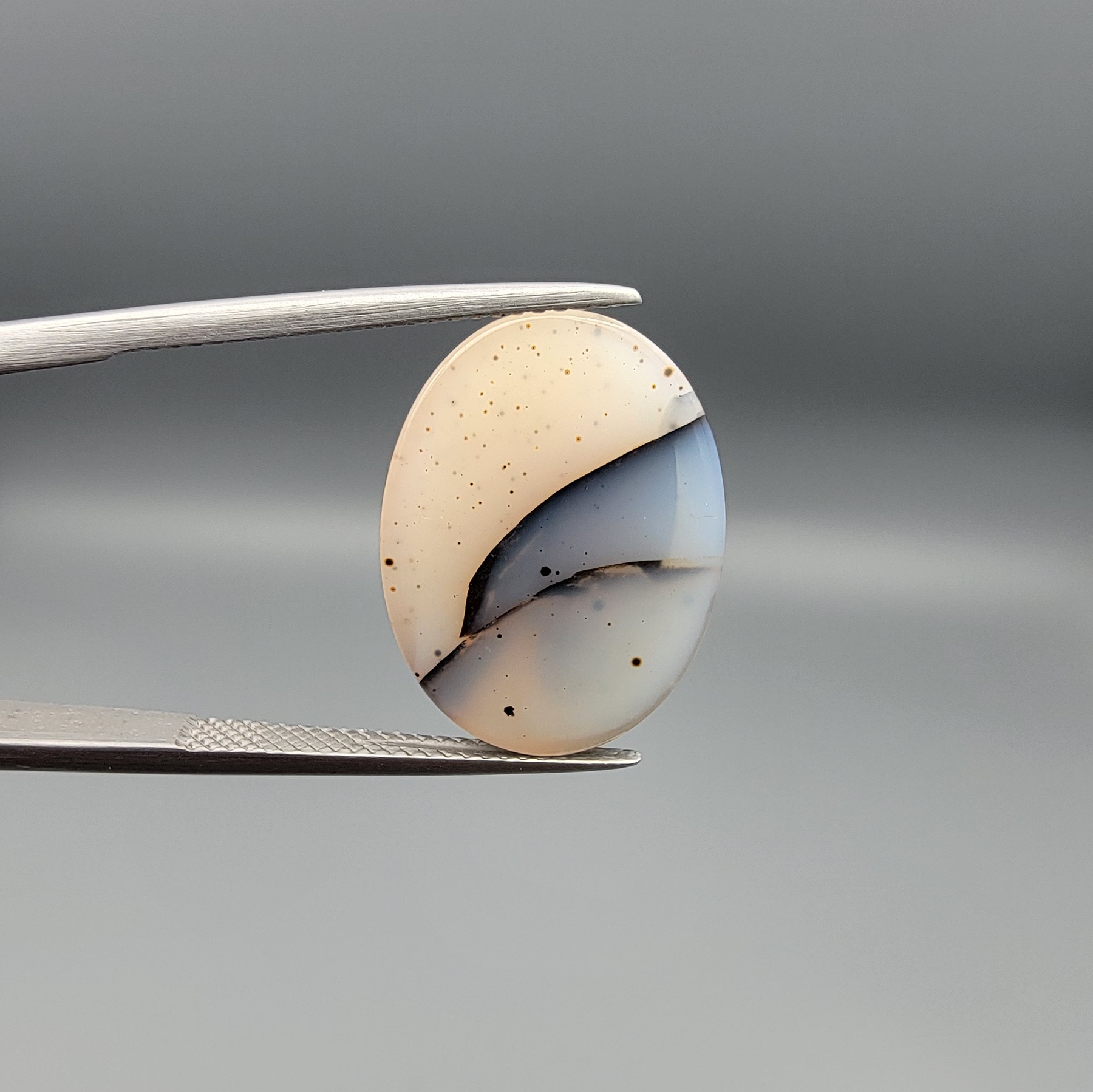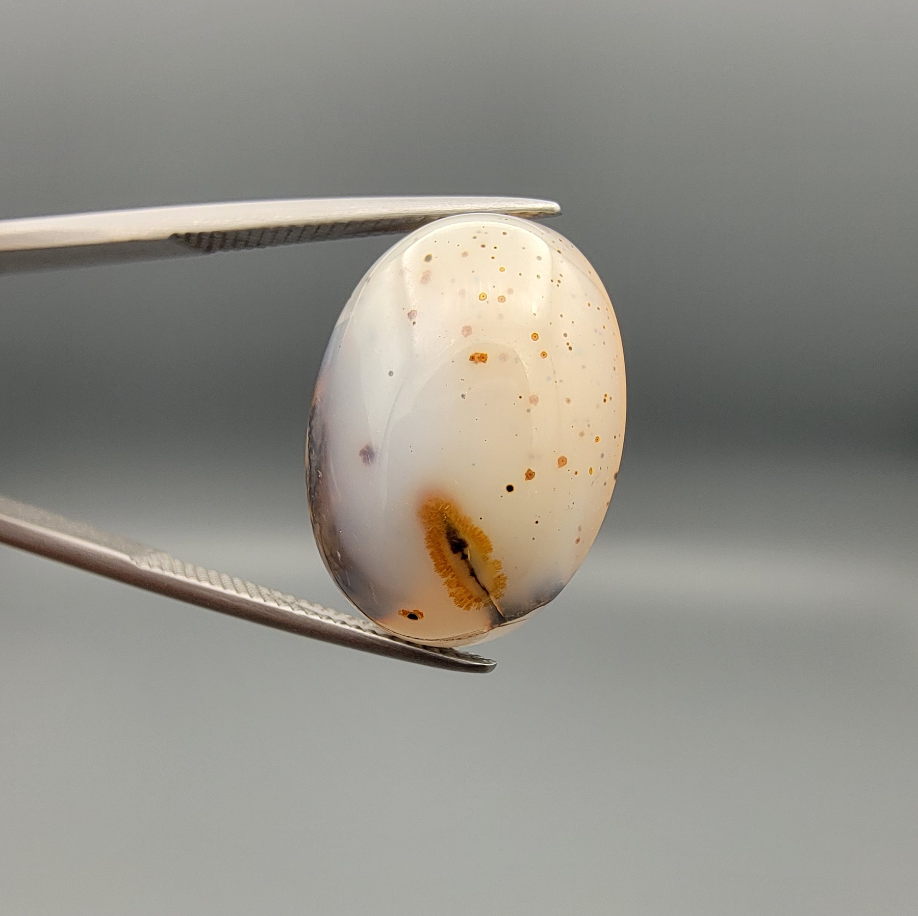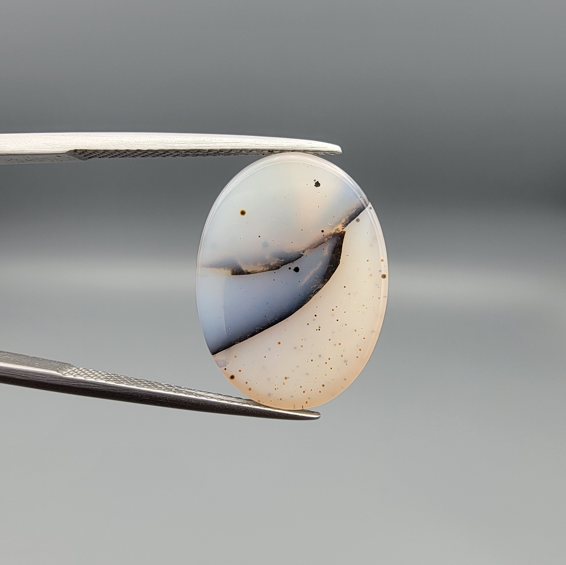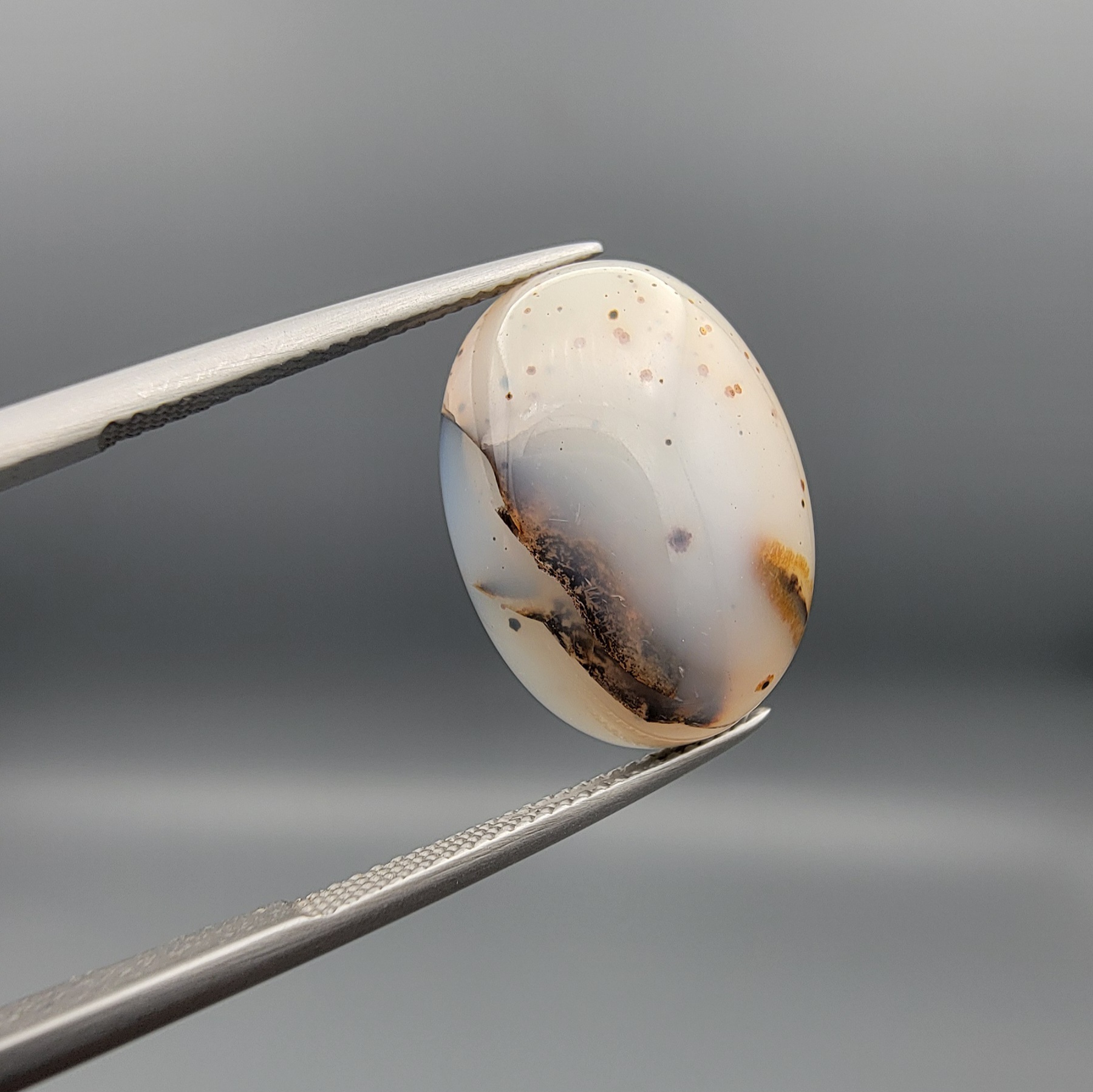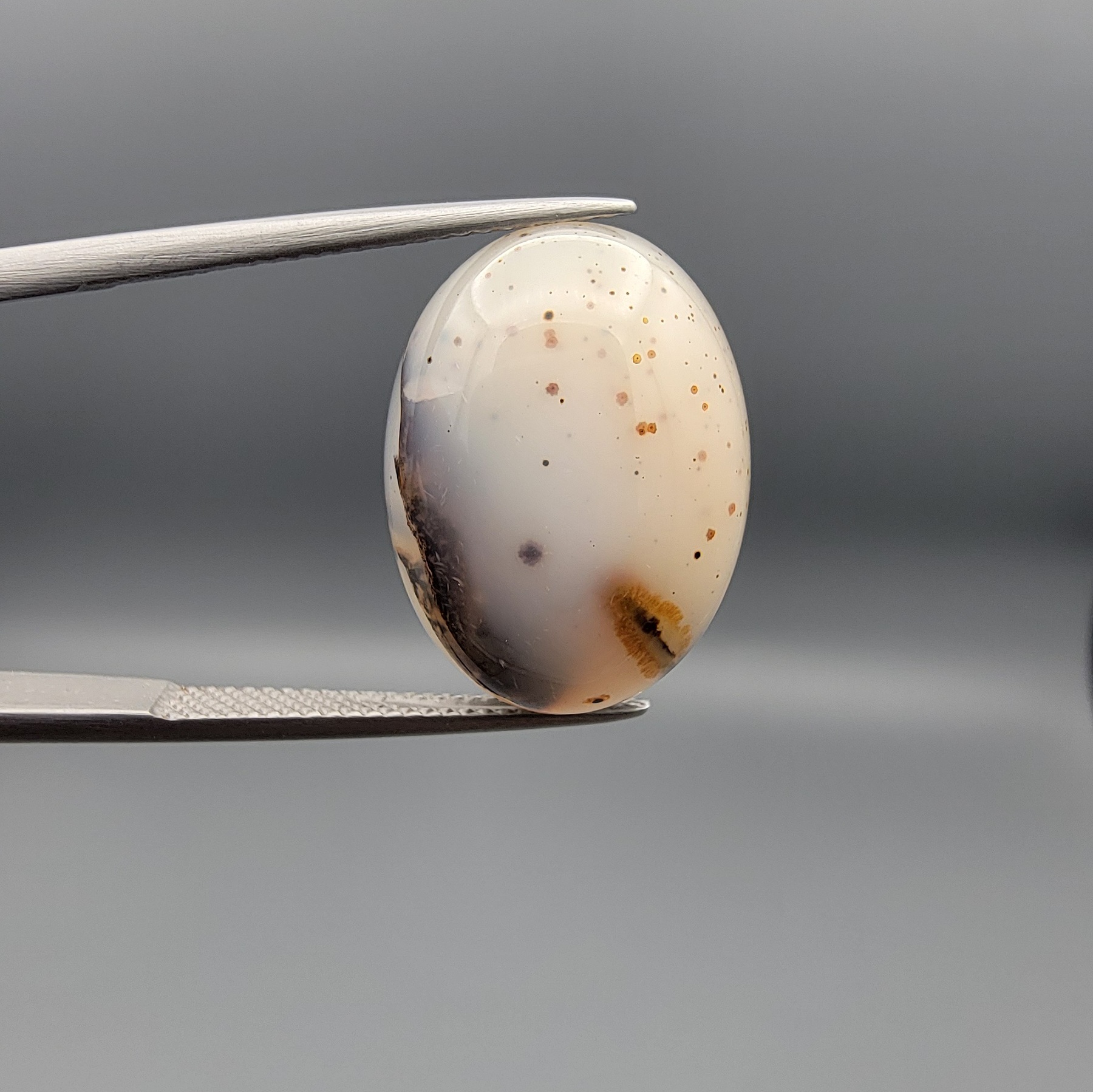 Witness the pinnacle of natural beauty with this 15.54-carat Natural Milky Dendritic Agate. Sourced from the premium deposits of Iran, this Shajari Dudhiya Aqeeq is a collector’s dream. It boasts an incredible depth of field, where black and brown mineral layers form intricate, hyper-realistic forest silhouettes that appear to grow from within the stone. These vivid patterns are equally stunning on the front and back, framed by a flawless, translucent milky-white agate. Masterfully polished into a substantial Oval Cabochon, this 100% natural, untreated masterpiece is intended for a world-class statement ring or a premier gemstone collection.